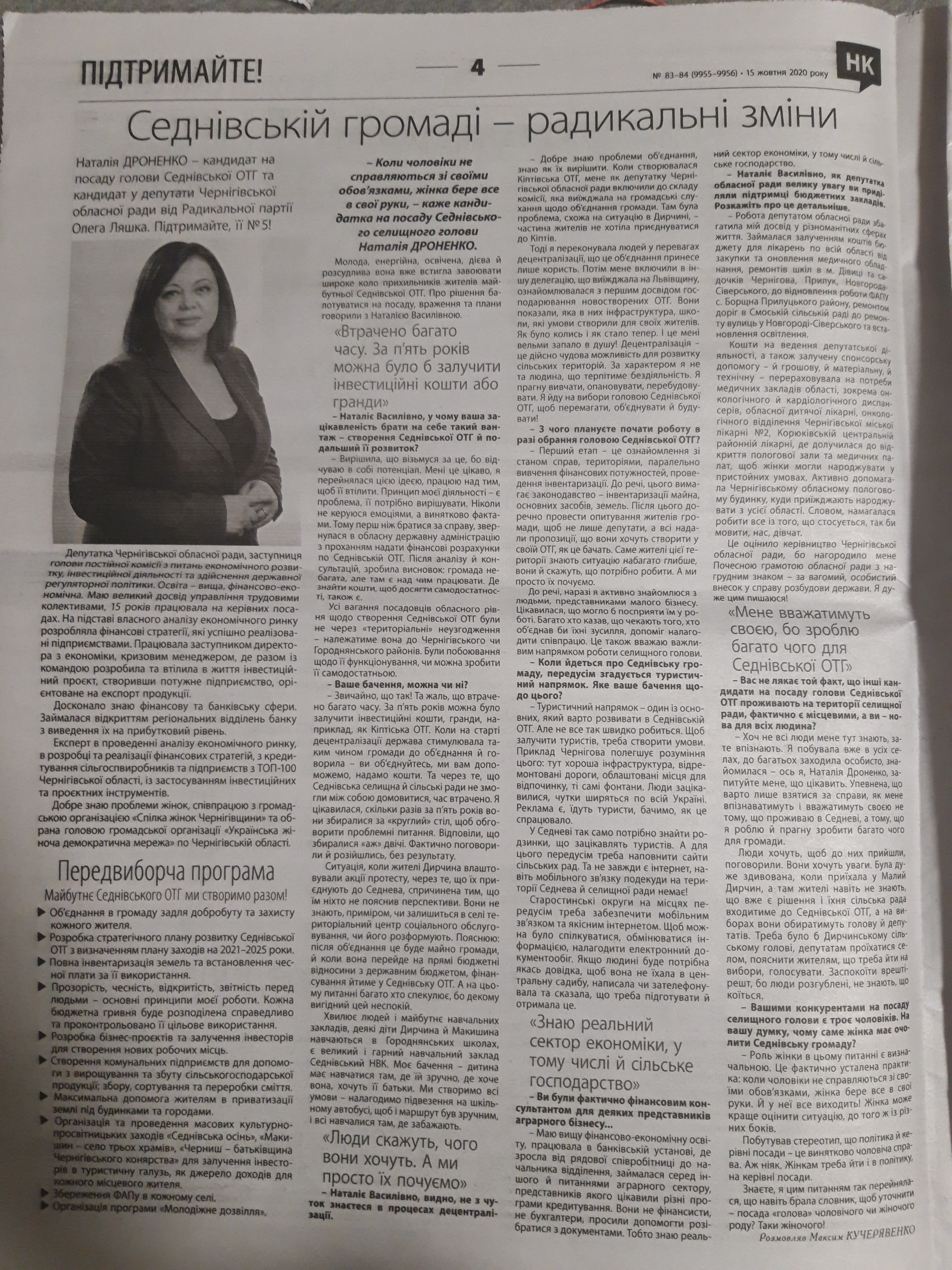 Видання Чернігівська районна газета «Наш край» (№83-84 від 15 жовтня 2020 року) з маркуванням «ПІДТРИМАЙТЕ!» розмістило матеріал «Седнівській громаді – радикальні зміни», де опублікували інтерв’ю та передвиборчу програму кандидатки на посаду Седнівської громади у депутати Чернігівської обласної ради від Радикальної партії Олега Ляшка Наталії Дроненко. У матеріали також містяться заклики підтримати кандидатку: «Підтримайте, №5!».