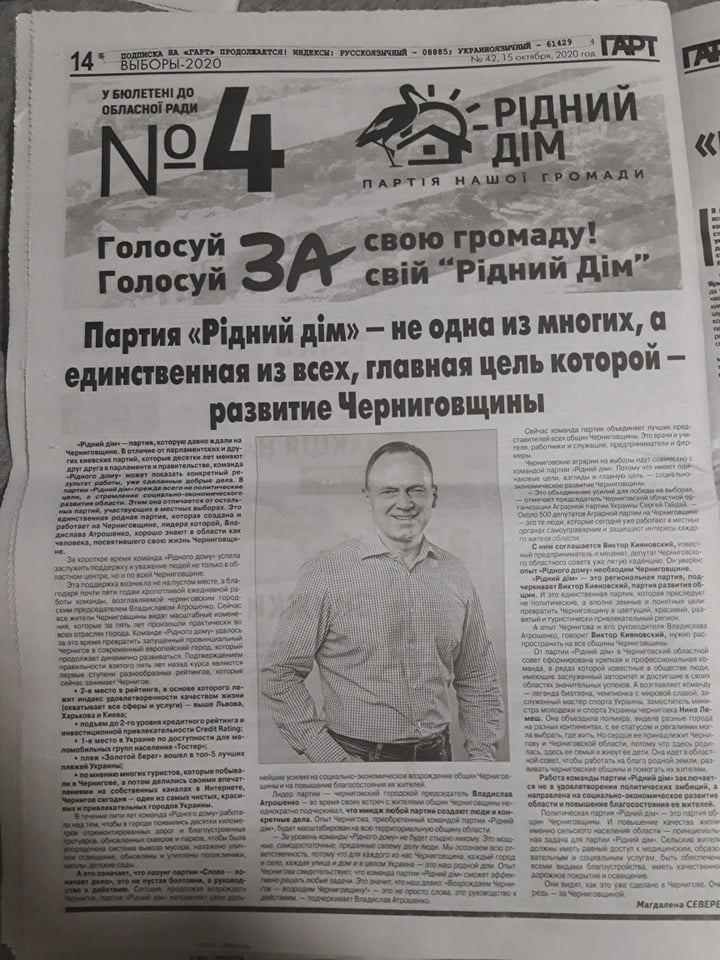 Газета «Гарт» (№42 від 15 жовтня 2020 року) на 14 сторінці в розділі «Выборы 2020» опублікували матеріал на підтримку партії «Рідний Дім», з логотипом партії, фото лідера партії Чернігівським міським головою – Владислав Атрошенко та його коментарями. Матеріал «Патрия «Рідний Дім» – не одна из многих, а единственная из всех, цель которой развитие Черниговщины» містить заклики підтримати парті «Голосуй За свою громаду. Голосуй За свій Рідний Дім!».