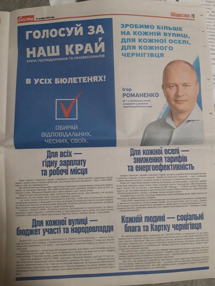 Випуск газети «Весть» (№42 від 2020 року) на 9 шпальті містить політичну рекламу на підтримку партії «Наш Край» та кандидата від партії Ігоря Романенко: «Голосуй за Наш Край. Сила Господарників та професіоналів. В усіх бюлетенях! Обирай відповідальних, чесних, своїх», «Зробимо більше на кожній вулиці, для кожної оселі, для кожного чернігівця. Ігор Романенко – №1 в загальному списку кандидатів у депутати Чернігівської міської ради».