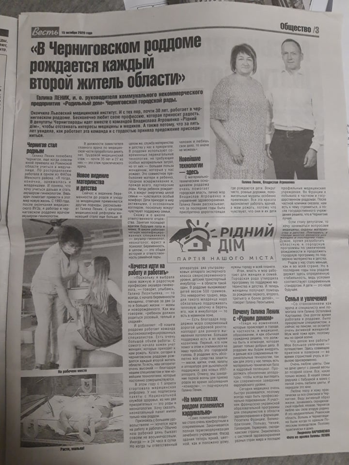 Той самий випуск газети «Весть» на сторінці 3 містить матеріал на підтримку кандидатки партії «Рідний Дім» в Чернігівську міську раду Галини Леник, яка наразі є в.о. комунального некомерційного підприємства Пологовий будинок Чернігівської міської ради з назвою «В Черниговском роддоме рождается каждый второй житель области». Публікація містить інформацію про кандидатку та партію, причини підтримки партії «Рідний Дім» та логотип партії.
