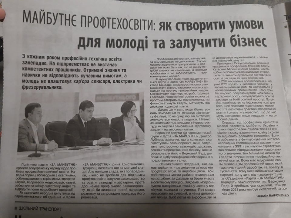 Так, в газеті «Деснянка» (№41 від 15 жовтня 2020 року) опублікувала матеріал «Майбутнє профтехосвіти: як створити умови для молоді та залучити бізнес», який містить інформацію про активність політичної партії «За майбутнє» та майже повністю складається зі згадок коментарів кандидатів партії.