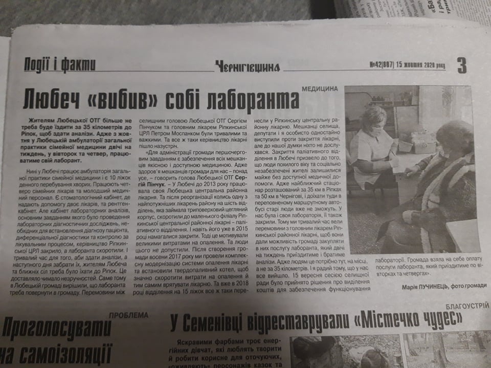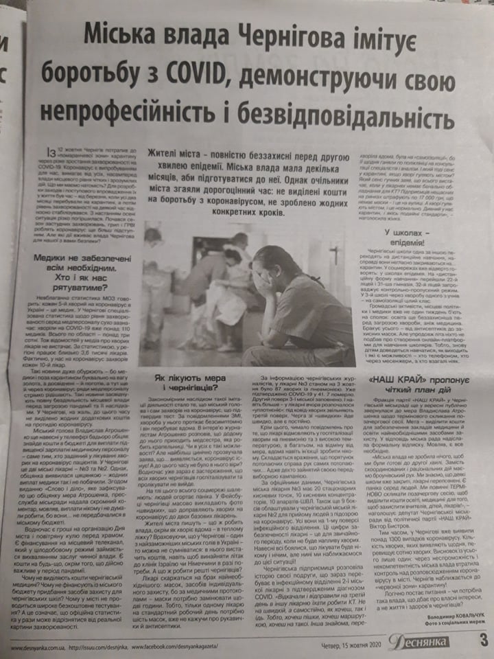 Випуск газети «Деснянка» (№41 від 15 жовтня 2020 року) на 3 сторінці в матеріалі «Міська влада Чернігова імітує боротьбу з COVID, демонструючи свою непрофесійність і безвідповідальність» опублікували план дій партії «Наш Край», щодо ситуації з COVID та додали коментар представника партії.