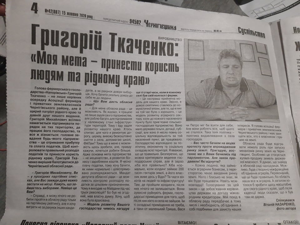 Видання газети «Чернігівщина» (№42 від 15 жовтня 2020 року) на 4 сторінці розмістили матеріал «Григорій Ткаченко: «Моя мета – принести користь людям і рідному краю», в якому розмістили інтерв’ю та фото з кандидатом. Нагадаємо, Григорій Ткаченко балотується кандидатом до Чернігівської обласної ради від партії «Радний Дім».