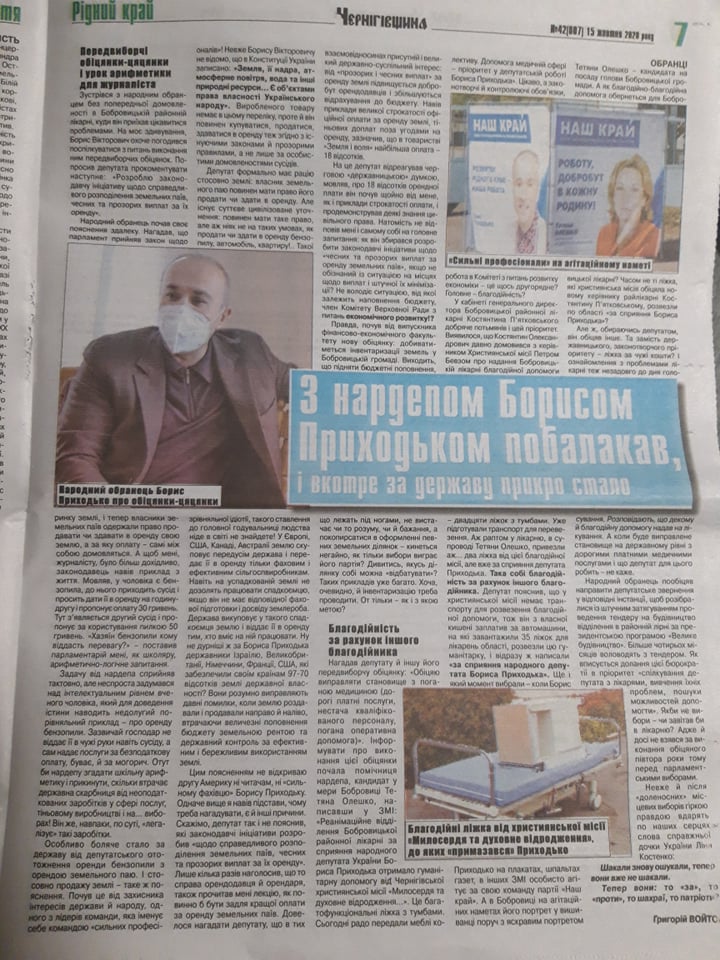 Вже на 7 сторінці цієї ж газети «Чернігівщина» розмістили наступний матеріал «Передвиборчі обіцянки-цяцянки і урок арифметики для журналіста», з фото стенду партії «Наш Край» й фото кандидата з написами «Сильні професіонали на агітаційному наметі», «Народний обранець Борис Приходько про обіцянки-цяцянки»,