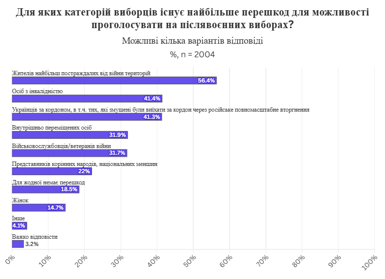 За даними цього дослідження, 31,9% респондентів переконані, що для внутрішньо переміщених осіб існує найбільше перешкод для реалізації активного виборчого права.
