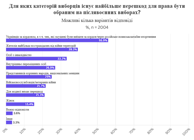Своєю чергою, 26,9 % опитаних вважають, що для внутрішньо переміщених осіб існує найбільше перешкод для реалізації пасивного виборчого права.