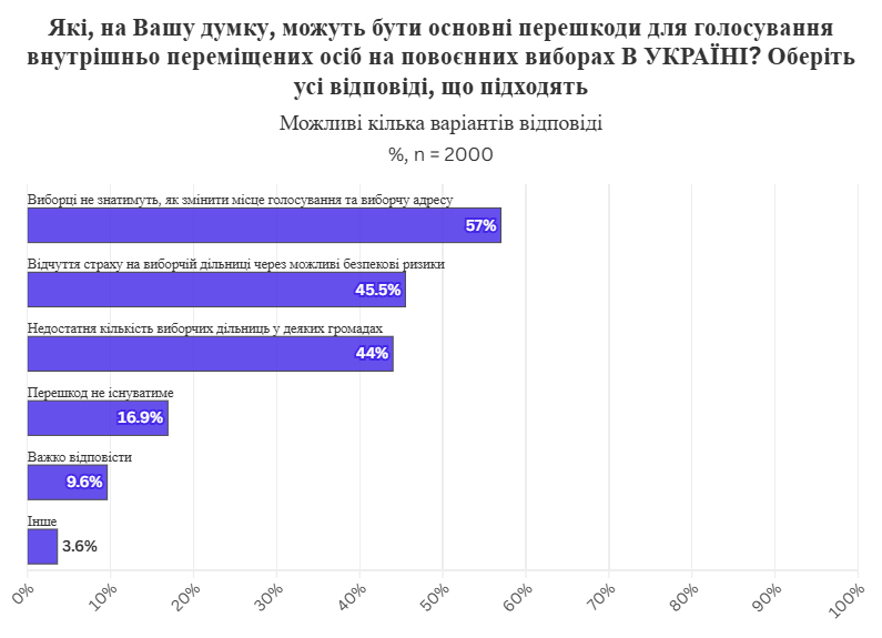 В інше дослідження, яке також провів на замовлення Громадянської мережі ОПОРА Київський міжнародний інститут соціології з 18 листопада 2024 року до 20 грудня 2024 року, увійшло питання стосовно основних перешкод для голосування внутрішньо переміщених осіб на повоєнних виборах. 57% опитаних вважають, що внутрішньо переміщені особи не знатимуть, як змінити місце голосування та виборчу адресу, а 45,5% переконані, що ВПО відчуватимуть страх на виборчій дільниці через можливі безпекові ризики. 44% опитаних зазначають, що найбільшою перешкодою для голосування ВПО стане брак приміщень виборчих дільниць у деяких громадах. 16,9% респондентів переконані, що жодних перешкод для такої категорії виборців не існуватиме.