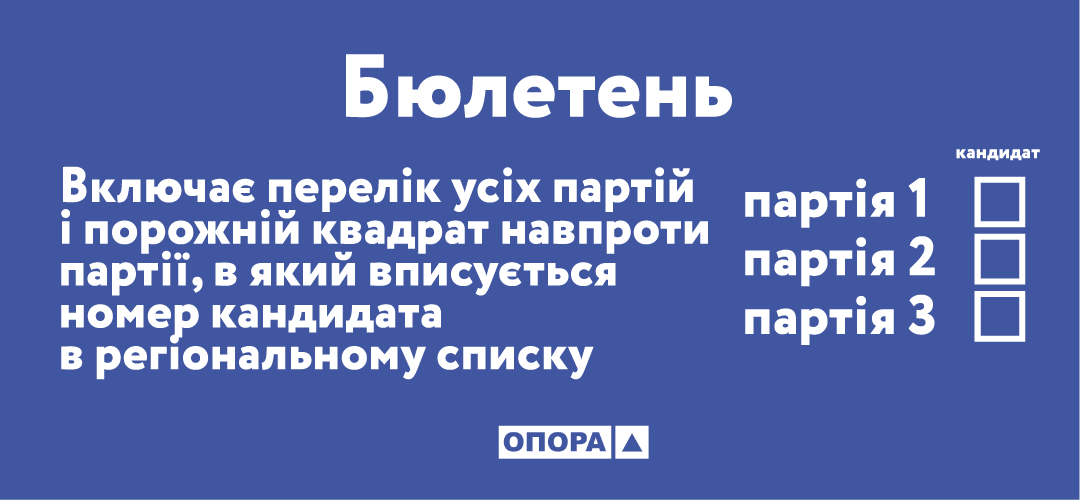 Текст виборчого бюлетеня включає в себе перелік усіх партій, які беруть участь у виборах (розміщуються у порядку, визначеному жеребкуванням), і порожній квадрат навпроти кожної партії, в який вписується порядковий номер конкретного кандидата в депутати з регіонального виборчого списку відповідної політичної партії. Таким чином виборець, визначивши партію, за яку він голосує, вписує у квадрат порядковий номер кандидата у депутати від цієї партії, якого він/вона підтримує. Голос за кандидата є одночасно голосом і за партію. У кожній кабінці для голосування обладнуються спеціальні стенди, де розміщуються: перелік політичних партій (із зазначенням їхніх порядкових номерів) і перелік кандидатів від кожної партії (із зазначенням їхніх порядкових номерів).