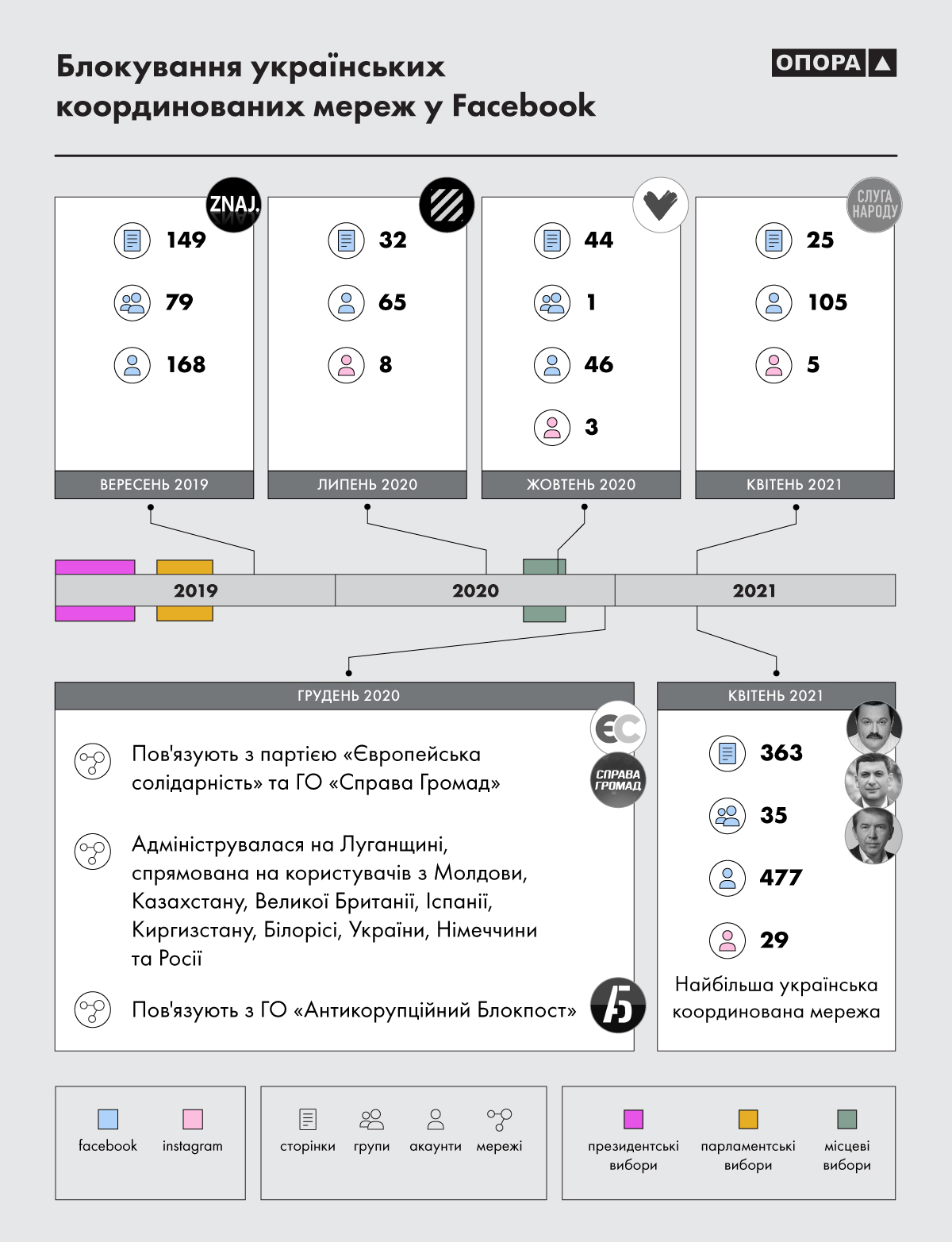 Перші випадки блокування мереж сторінок в українському сегменті Facebook відбулися у вересні 2019 року. З того часу до травня 2021 року адміністрація заблокувала 924 облікові записи, 706 сторінок, 153 групи та 80 акаунтів в інстаграмі, які базувалися в Україні та намагались вплинути на внутрішньоукраїнський політичний дискурс.