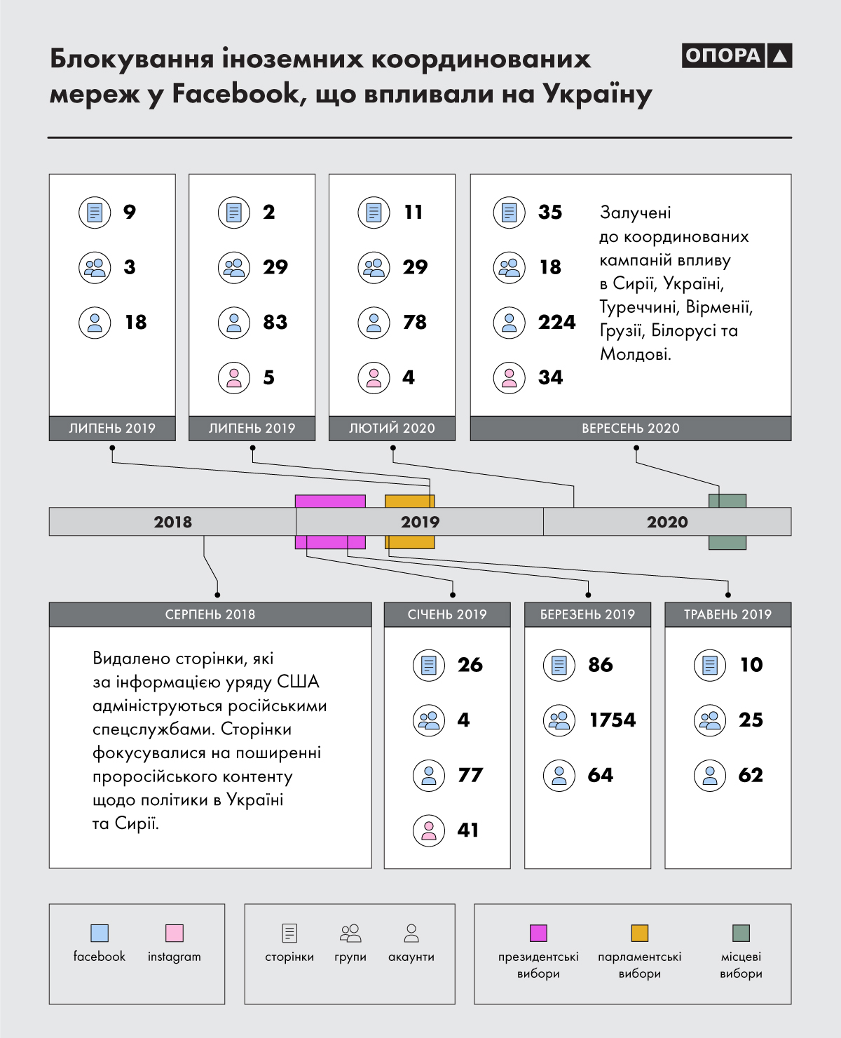 Перші блокування сторінок в українському сегменті фейсбука у 2019 році стосувалися спроб саме зовнішнього втручання в українську суспільну дискусію з боку Росії. Втім згодом такі мережі почали з’являтися і в самій Україні. ОПОРА дослідила всі звіти корпорації Facebook щодо блокування сторінок та виокремила з них мережі, які впливали на українських користувачів.