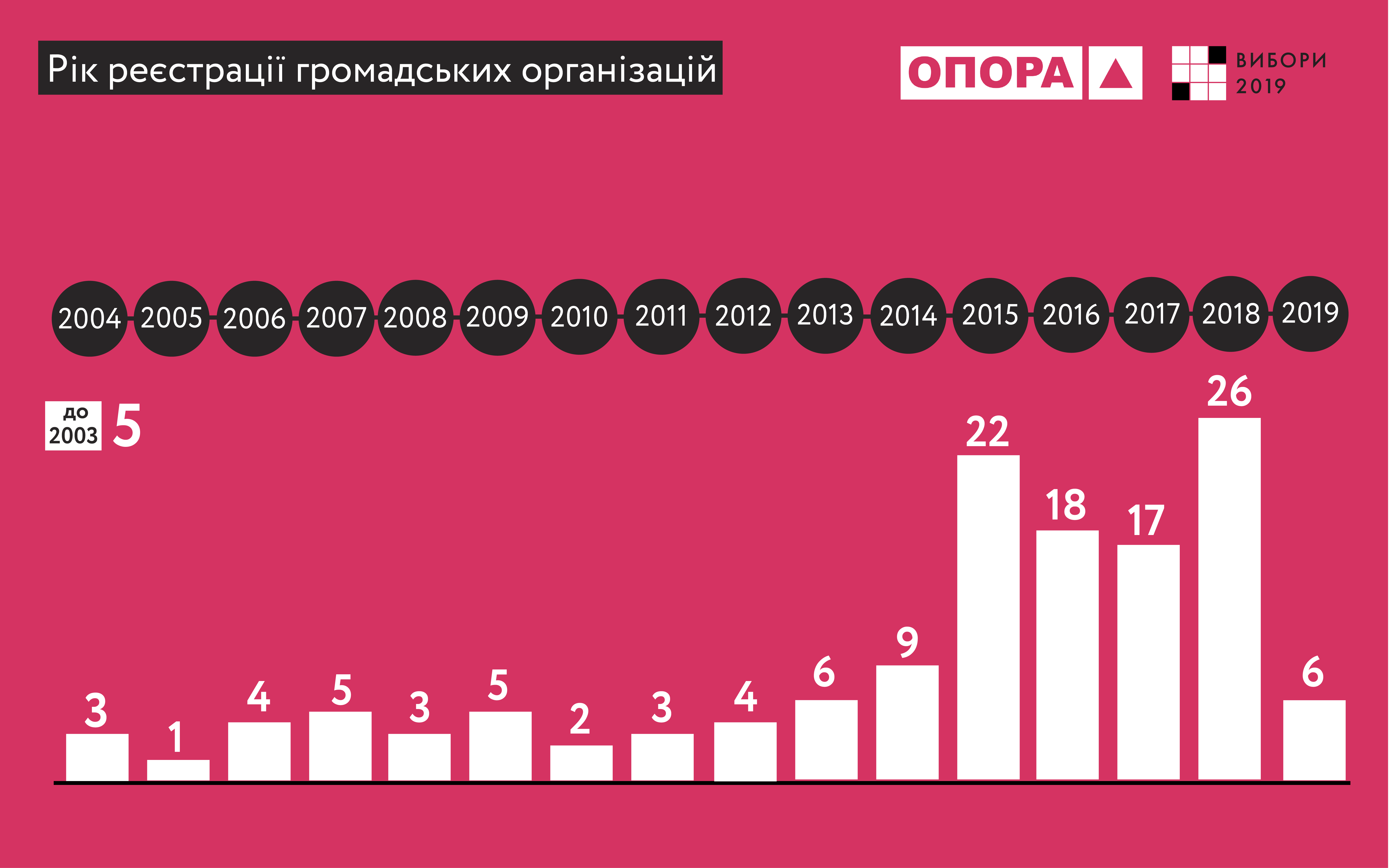 Ми також дослідили дату реєстрації громадських організацій. Як видно з інфографіки, більшість ГО зареєстровані після 2014 року. 26 громадських організацій зареєстровано у 2018 році, ще 6 – у січні 2019-го, серед них: