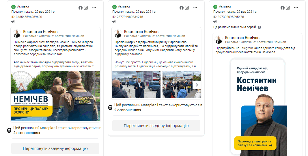 3656 доларів за місяць на рекламні дописи витратили на сторінці кандидата на посаду міського голови Костянтина Немічева. Платником вказаний особисто Немічев. Частина дописів була присвячена зустрічам Немічева, а частина рекламі його соціальних мережах. наприклад, телеграм-каналу.