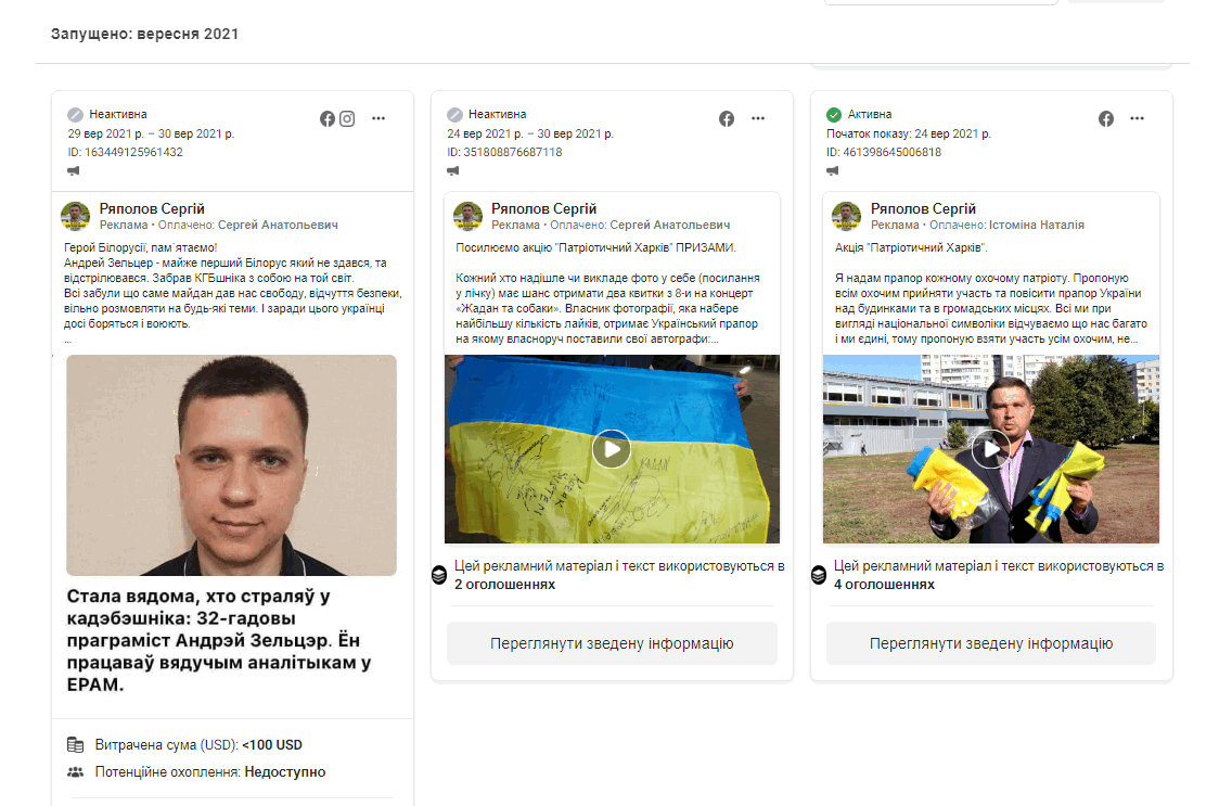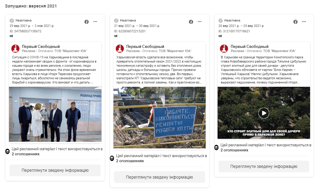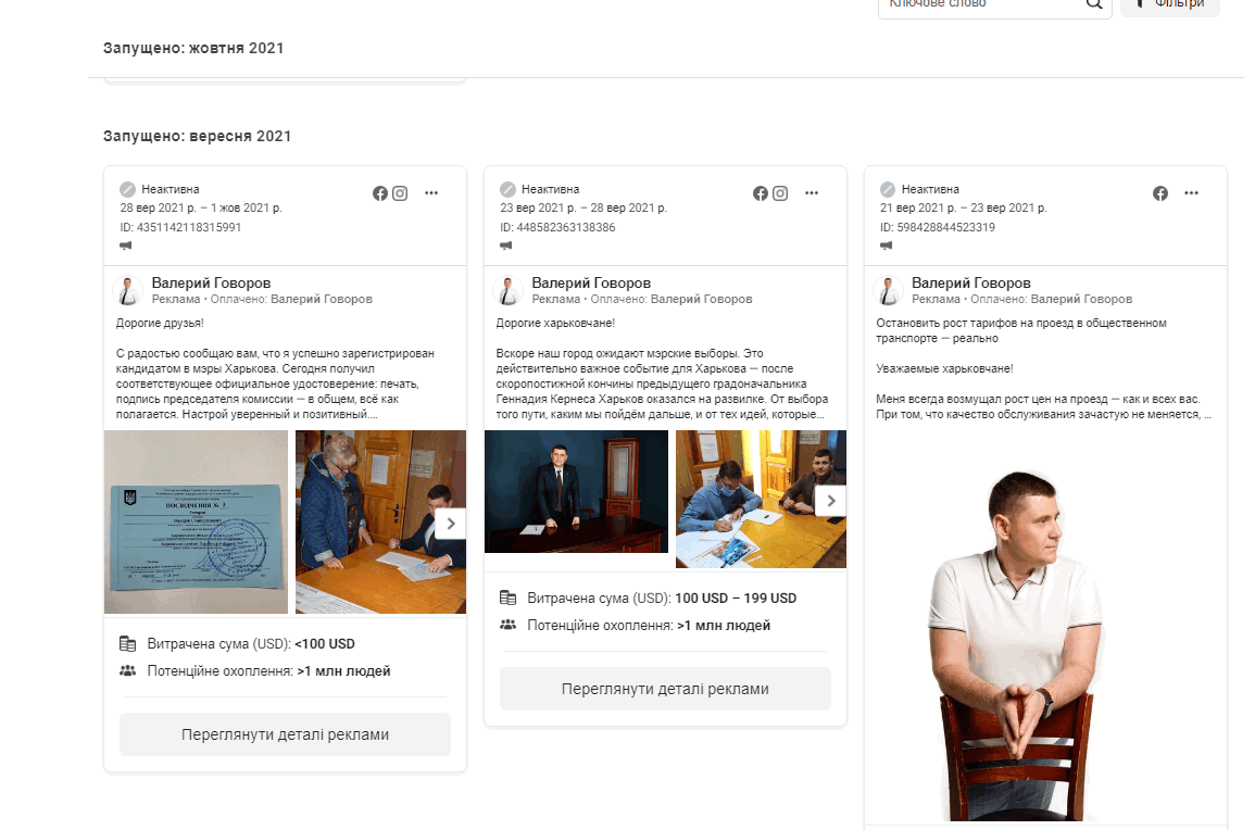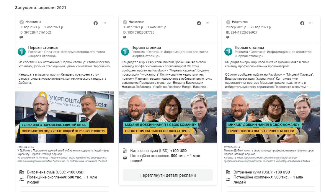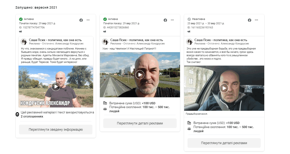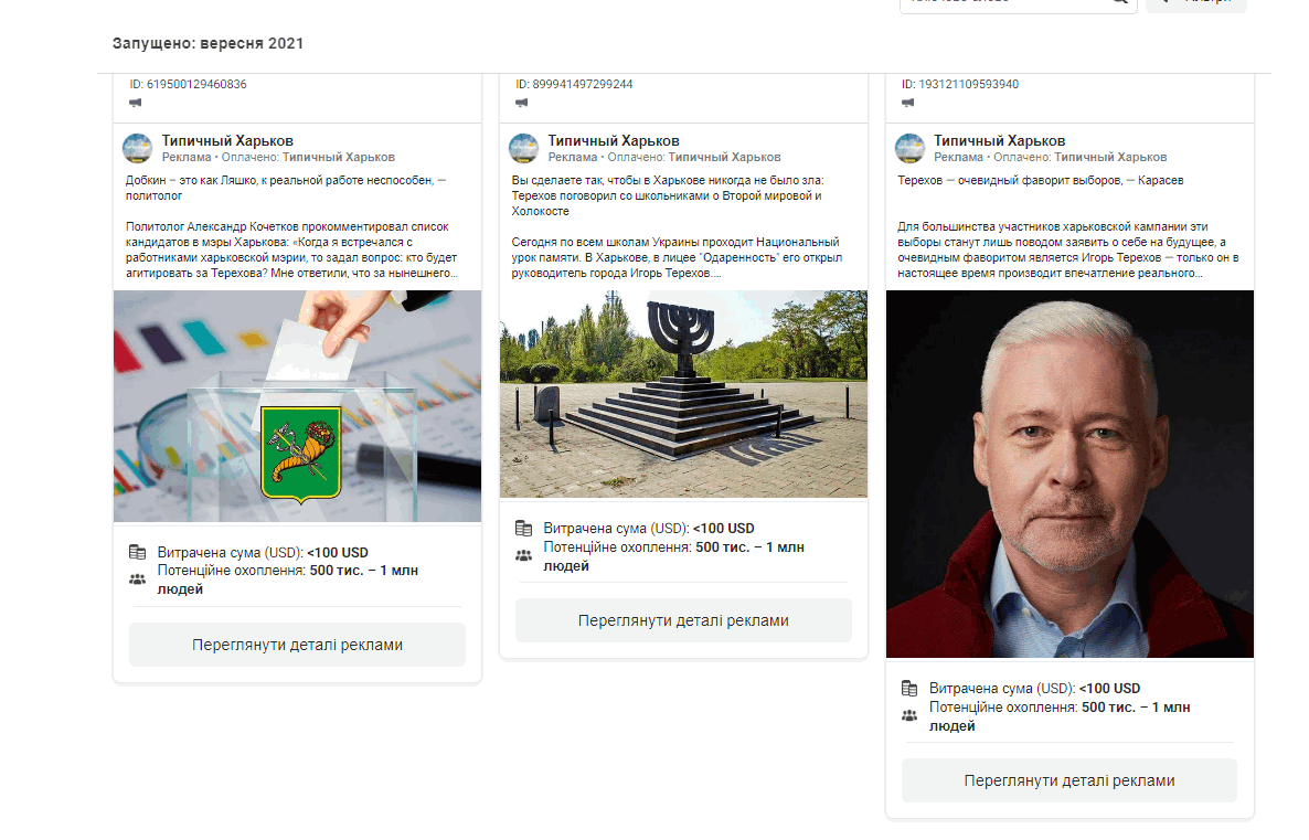 Нагадаємо, що минулого місяця на рекламу потенційних кандидатів на посаду міського голови витратили близько 21 тис. дол. Раніше ОПОРА проаналізувала усю політичну Facebook-рекламу, що транслювалась за три місяці до офіційного початку виборчого процесу (у проміжку між 11 червня та 11 вересня 2021 року). Аналітики мережі виявили 40 сторінок, що в сукупності витратили на рекламу у Facebook 77612 дол. (понад 2,07 млн грн) та транслювали 2754 рекламні дописи. Серед цих сторінок були і приховані мережі, що агітували та дискредитували того чи іншого кандидата.