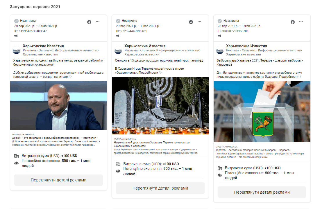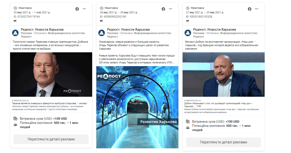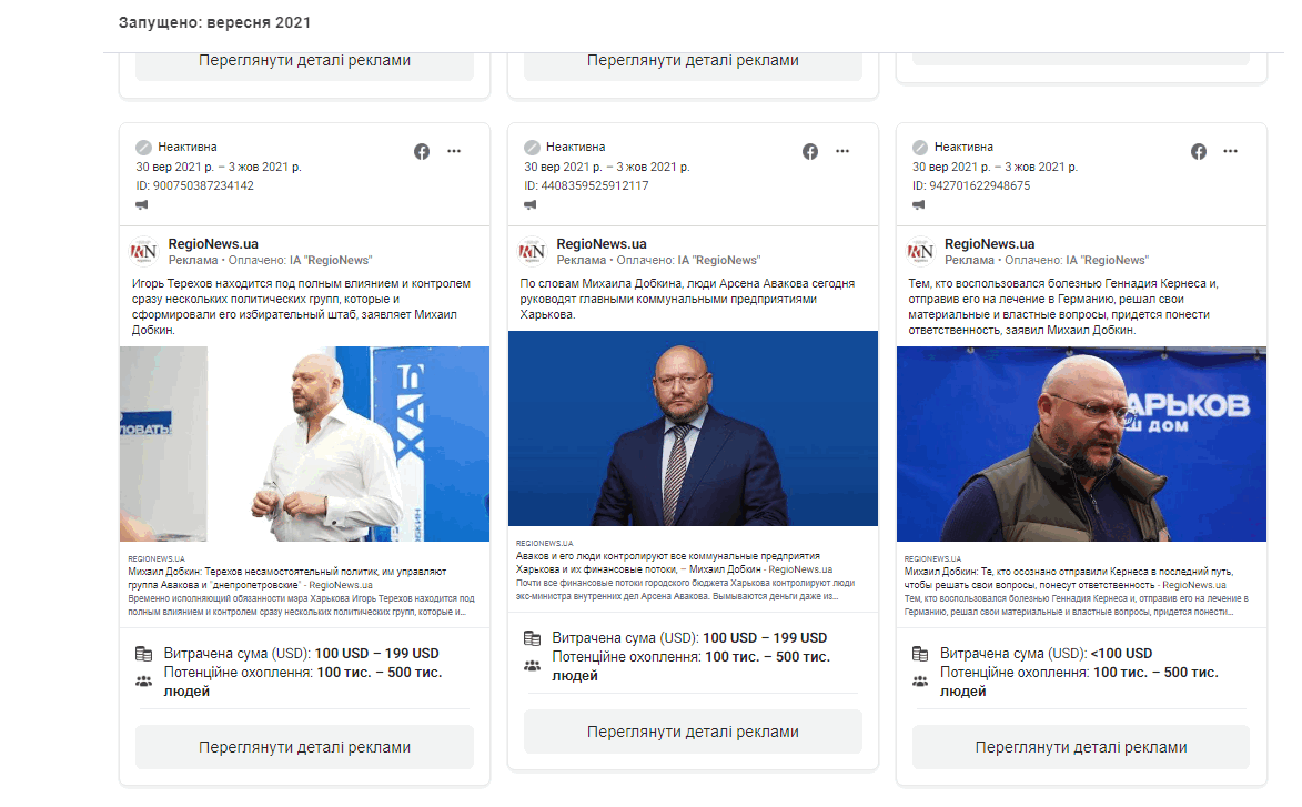 Найбільше на рекламу у Facebook та Instagram витратила сторінка RegioNews.ua, де активно рекламують Михайла Добкіна та критикують в.о. мiського голови Ігоря Терехова. На рекламу сторінки витратили 5962 долари. Всі оплачені «IA «RegioNews».