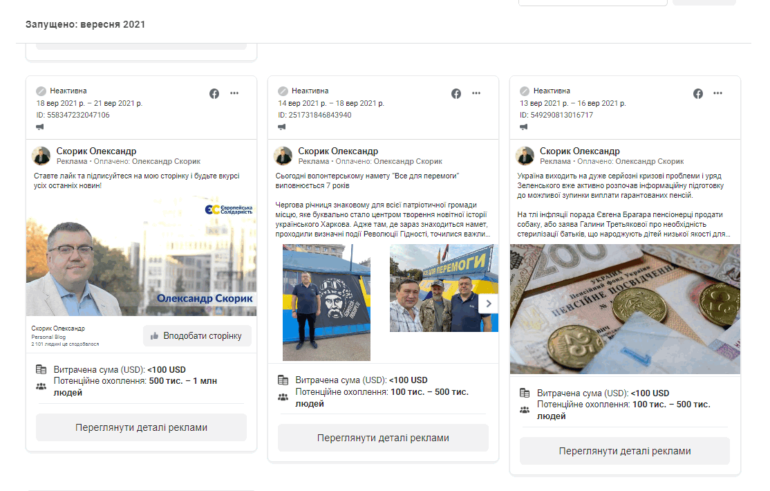 354 долари на рекламу у Facebook витратив кандидат від партії “Європейська Солідарність” Олександр Скорик. Рекламні дописи в основному стосувалися загальноукраїнських тем, а не локальних.