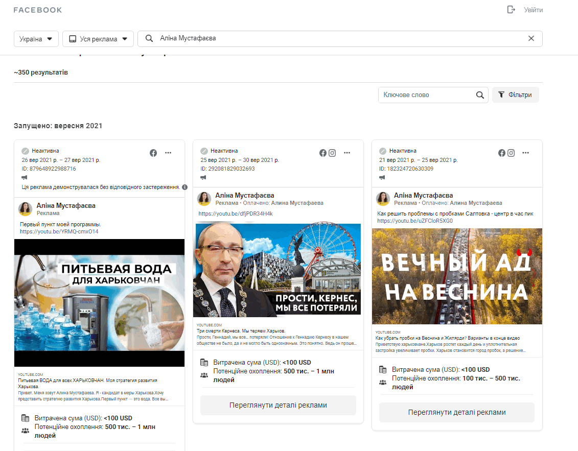 Всю рекламу депутатка Харківської міської ради оплатила самостійно. Серед рекламних дописів – презентація програми кандидатки Мустафаєвої. Зокрема вона піднімає питання якості води. Варто відзначити, що саме цей пост не був промаркований, що він стосується виборів. Тому соціальна мережа зупинила показ цієї реклами. Є також рекламні дописи з критикою міської влади.