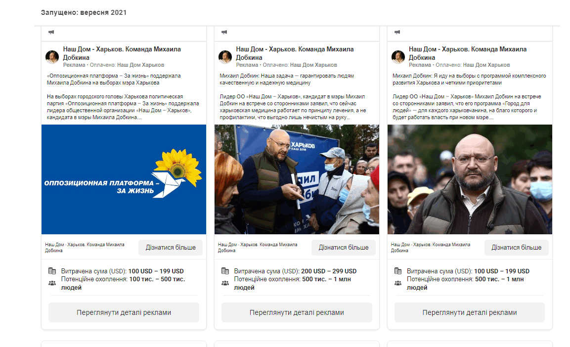 Сторінка “Наш Дом Харьков. Команда Михаила Добкина” витратила на рекламу у соціальних мережах 4462 долари. Рекламу оплачувала сама організація.