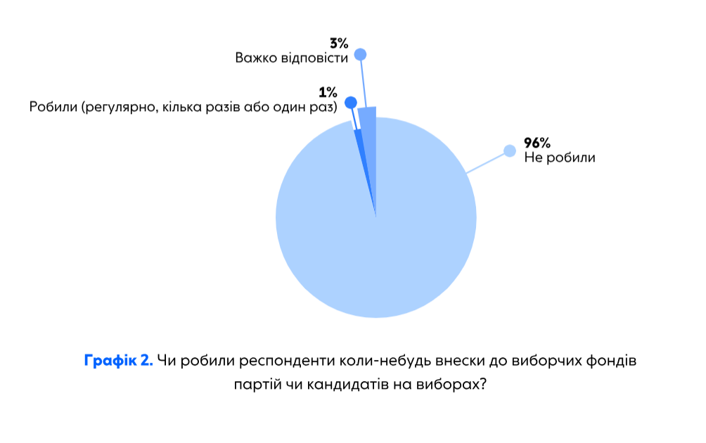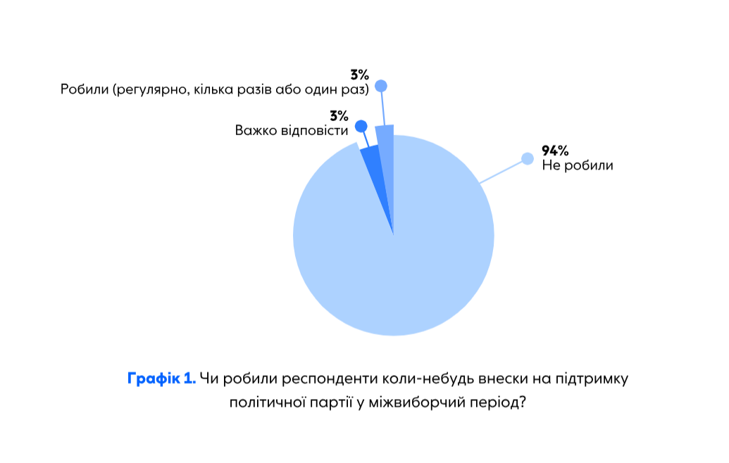 Наші громадяни не демонструють бажання особисто брати участь у фінансуванні діяльності політичних партій. 96% опитаних вказали, що вони ніколи не робили внесків до виборчих фондів партій чи кандидатів на виборах (робили подібні внески 1%), а 94% — ніколи не робили внесків на підтримку політичної партії у міжвиборчий період (робили внески близько 3%).
