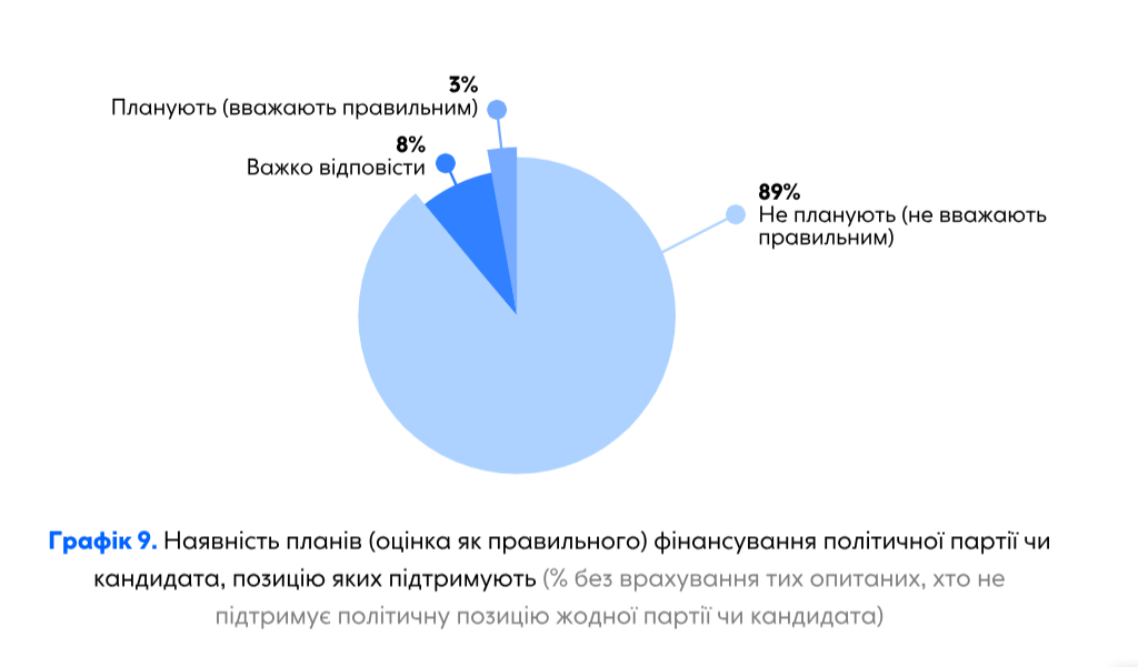Немає підстав очікувати зростання активності населення щодо фінансування наявних політичних партій чи політиків (навіть тих, чию політичну позицію громадяни поділяють). Адже лише 3% респондентів, які мають подібні симпатії, зазначили, що планують (або вважають правильним) фінансувати відповідну політичну партію чи кандидата; натомість 89% не мають таких планів.
