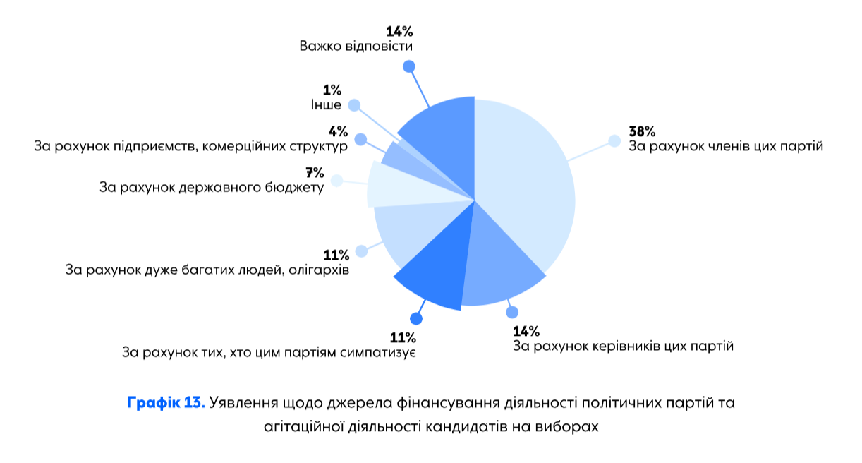 У суспільстві переважає думка, що політичні сили мають фінансувати себе самостійно за власний рахунок. Зокрема, 38% опитаних вважають, що політичні партії й кандидати мають фінансувати агітацію за рахунок членів цих партій, 14% виходять з того, що таке фінансування мають забезпечувати керівники партій, а 11% підтримують фінансування тими, хто симпатизує цим партіям і кандидатам, або багатими людьми. Натомість надання коштів з державного бюджету підтримали тільки 7% респондентів.