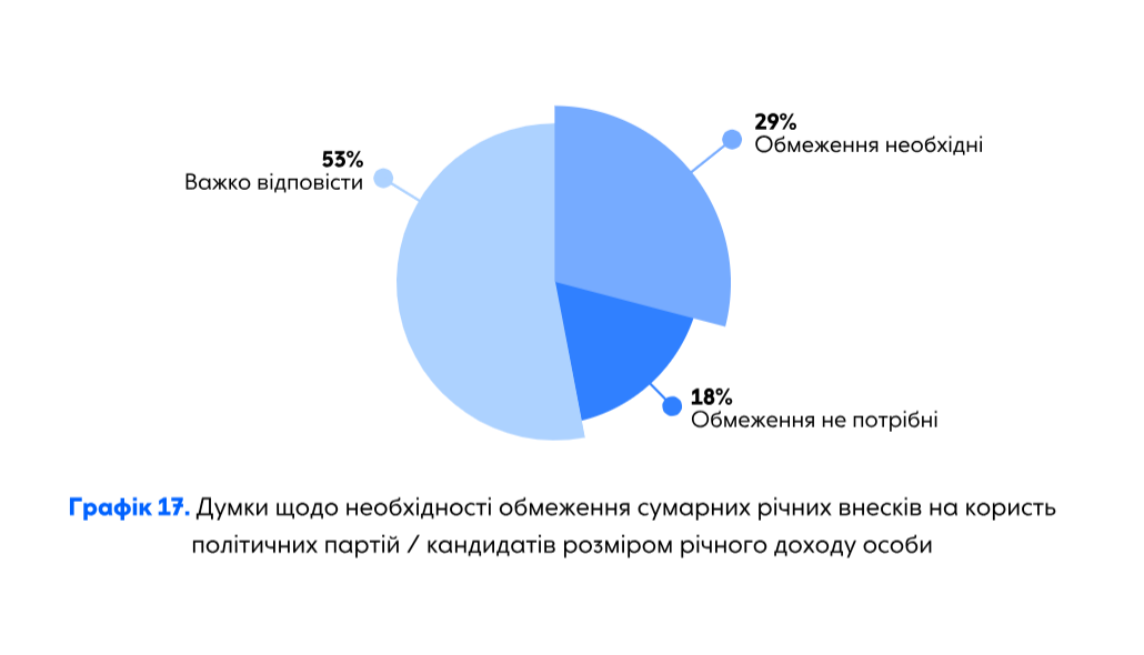 Половина опитаних не змогли визначитися щодо того, чи варто обмежувати сумарні річні внески на користь політичних партій / кандидатів певною сумою, а ще 18% не вважають за потрібне запровадження таких обмежень. Підтримують законодавче обмеження фінансування політичних суб’єктів лише 29% респондентів.