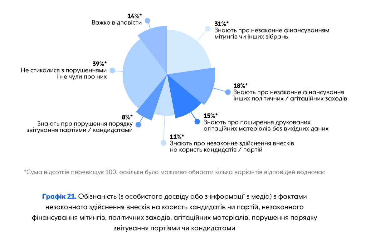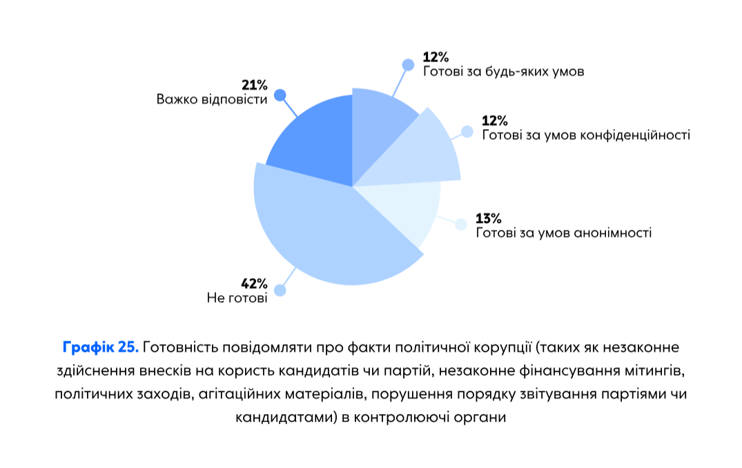 Досить обмеженою виявилася готовність респондентів інформувати контролюючі органи про такі дії, як незаконне здійснення внесків на користь кандидатів чи партій, незаконне фінансування мітингів, політичних заходів, агітаційних матеріалів, порушення порядку звітування партіями чи кандидатами. Більшість опитаних або не готові подавати таку інформацію (42%), або не мають визначеної позиції (21%). Натомість без всяких умов готові вдаватися до подібних дій 12% респондентів, а 25% згодні на це за умов конфіденційності й анонімності.