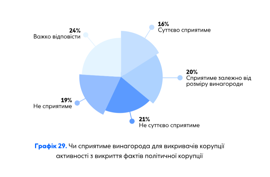 Наші співгромадяни переважно не бачать користі від запровадження винагороди тим особам, які повідомлятимуть контрольні органи про випадки порушення фінансових вимог щодо виборчої діяльності партій та кандидатів. Лише 36% опитаних вважають, що подібна практика суттєво посприяє протидії таким порушенням, 21% очікують несуттєвого сприяння, а 43% нічого від цього не очікують або не змогли визначитися в цьому питанні.