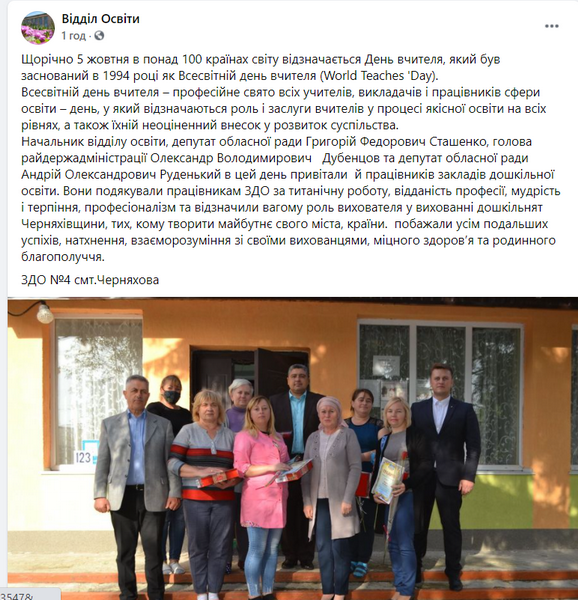 «...Начальник відділу освіти, депутат обласної ради Григорій Федорович Сташенко, голова райдержадміністрації Олександр Володимирович Дубенцов та депутат обласної ради Андрій Олександрович Руденький в цей день привітали й працівників закладів дошкільної освіти. Вони подякували працівникам ЗДО за титанічну роботу, відданість професії, мудрість і терпіння, професіоналізм та відзначили вагому роль вихователя у вихованні дошкільнят Черняхівщини, тих, кому творити майбутнє свого міста, країни побажали усім подальших успіхів, натхнення, взаєморозуміння зі своїми вихованцями, міцного здоров’я та родинного благополуччя…», – йдеться у повідомленні на сторінці «Відділ освіти».