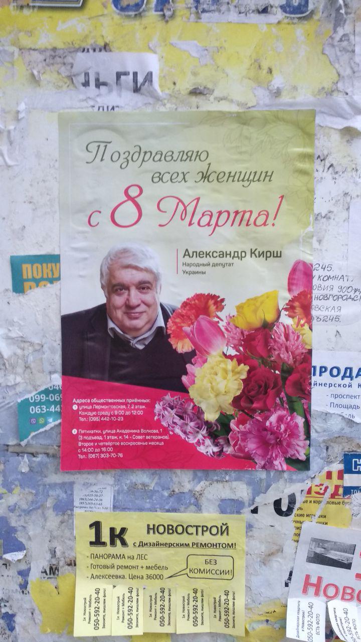Нардеп Олександр Кірш вітав жінок з 8 березня своїми листівками, які були наклеєні на будинках, розташованих в окрузі, за яким він обирався. На листівках, окрім привітання зі святом написані адреси громадських приймалень народного обранця.