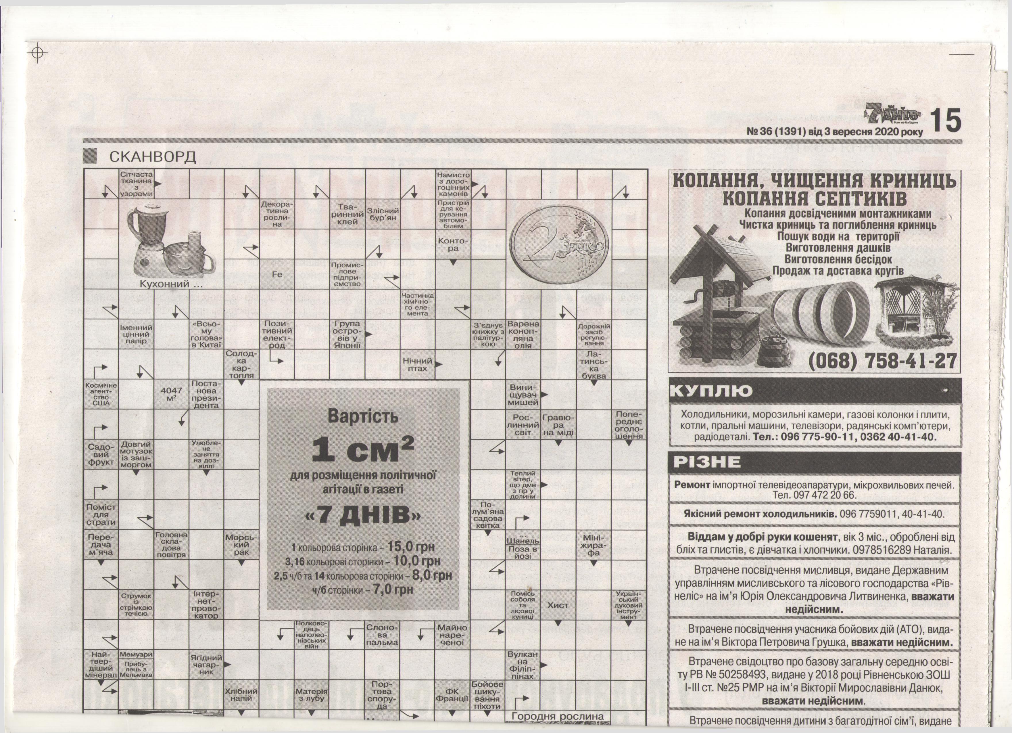 У газеті «Сім днів» вартість 1 см2 за розміщення політичної реклами залежить не тільки від кольору паперу, але й порядкового номеру сторінки газети: