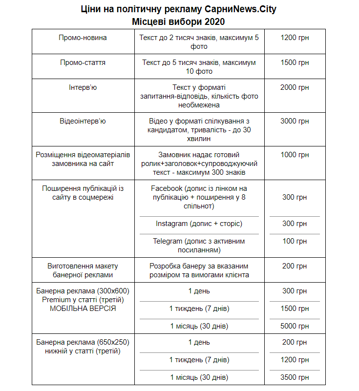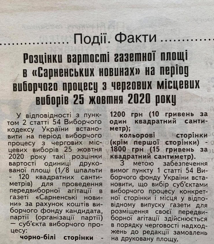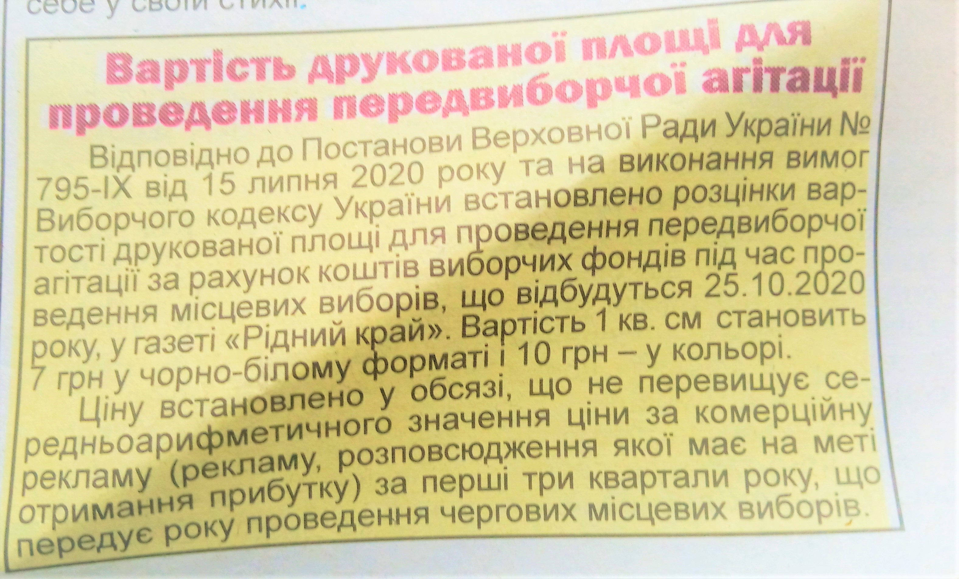 Газета «Володимирецький вісник» встановила такий прайс на політичну рекламу: