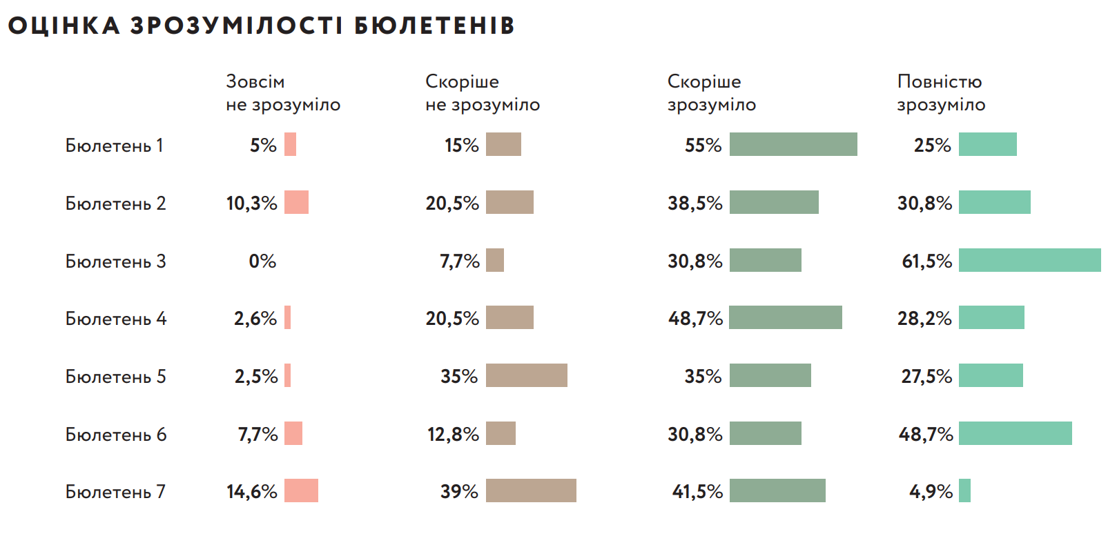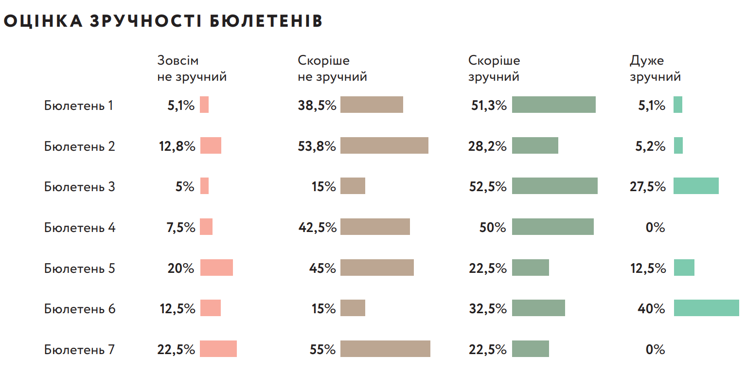 Найбільше респондентам фокус-групових досліджень сподобався варіант бюлетеня №3. Він був найзрозумілішим. Також високі оцінки отримав макет №6. Під час експерименту при заповненні варіантів бюлетенів №3 і №6 практично не траплялися помилки, через які б було неможливо встановити волевиявлення. Ці ж макети визначені найзручнішими, хоча цього разу перевага була за варіантом №6. Водночас стосовно нього спостерігається більша поляризація – одночасно більша кількість оцінок “абсолютно не зручно”. Найбільш типовою помилкою заповнення бюлетенів під час експерименту було обрання кандидатів відразу від кількох чи всіх партій. Стосовно інформативності запропонованих бюлетенів, то до кожного із запропонованих макетів були свої зауваження. У варіанті №7 – інформації було забагато. А от бюлетені №1, №3, №4, №5, №6 отримали майже однакові оцінки стосовно інформативності.
