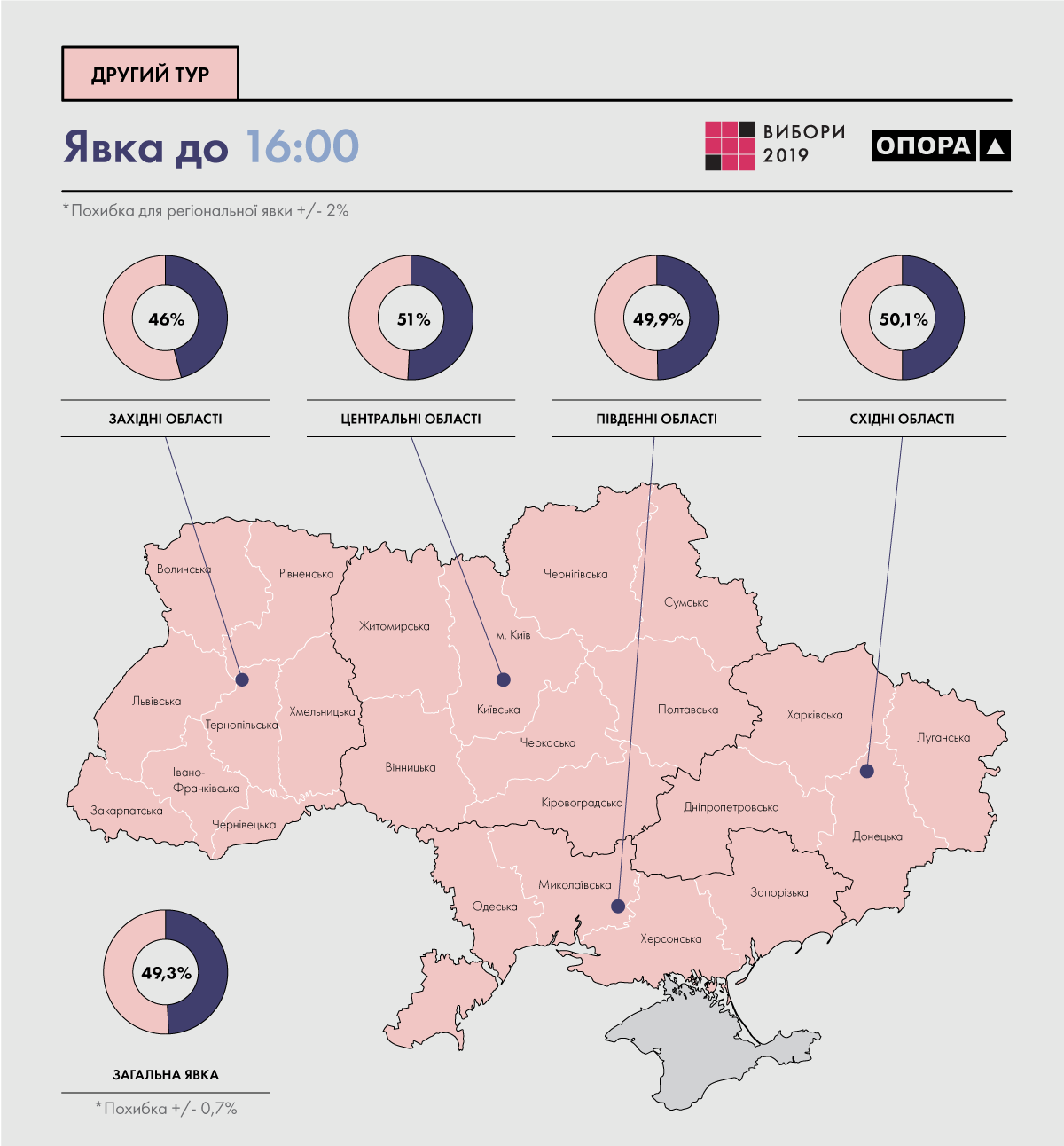 За даними спостерігачів ОПОРИ, явка на 16:00 21 квітня на виборах Президента України складає 49,3% з похибкою 0,7%.