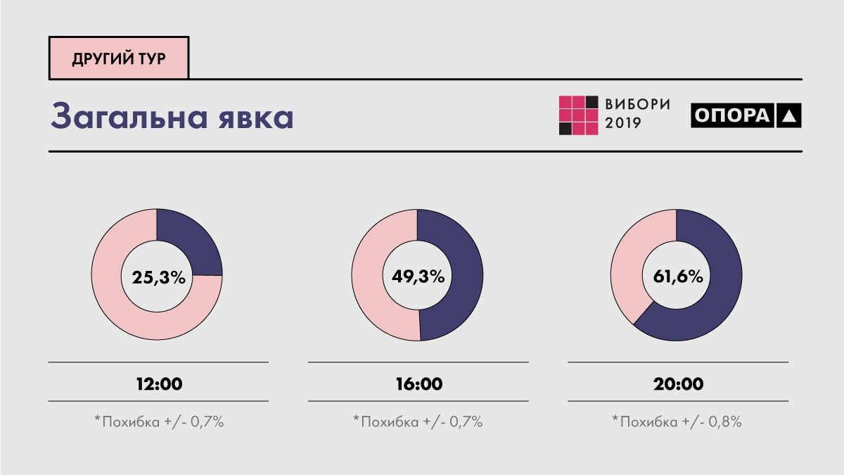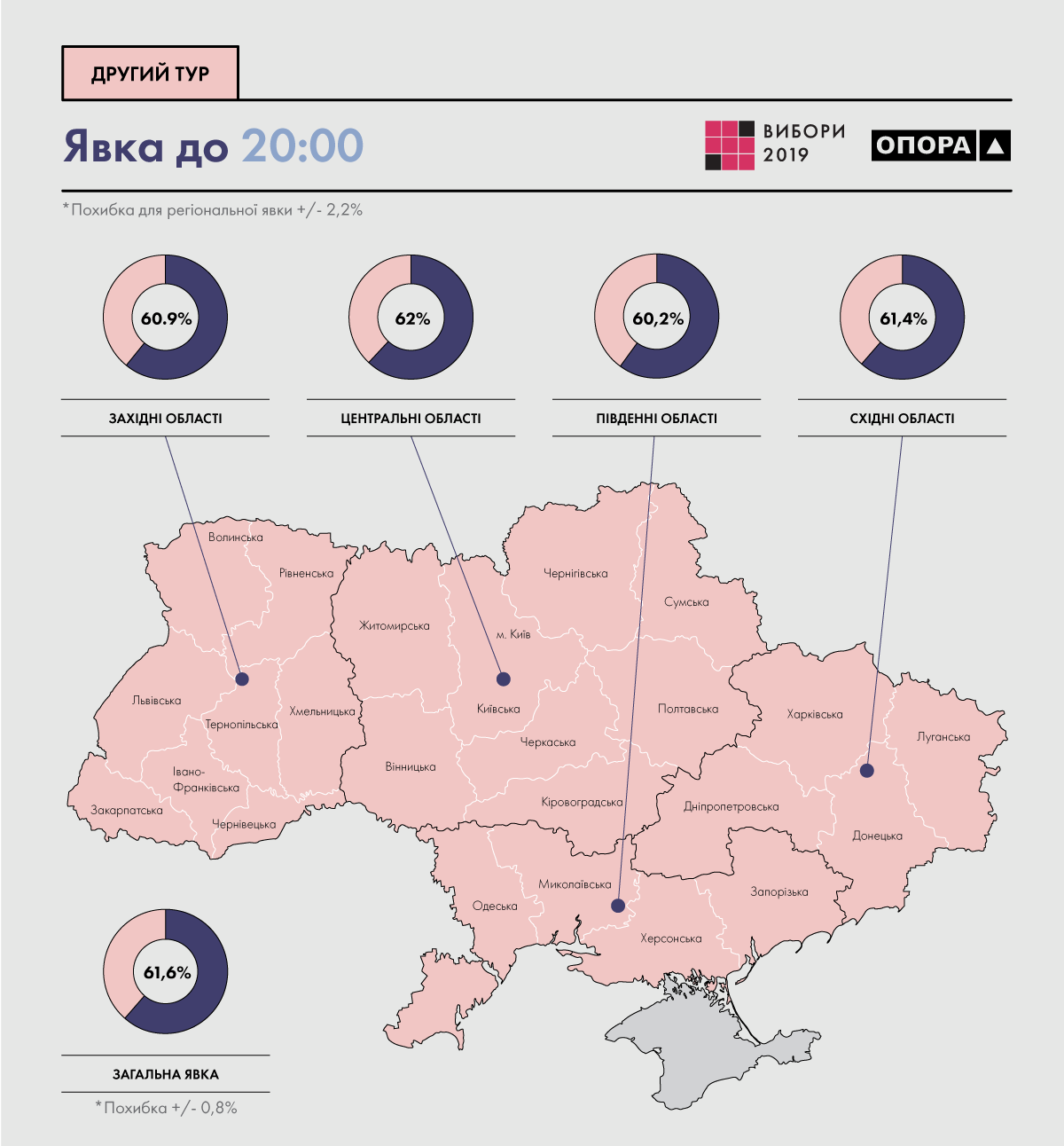 За даними спостерігачів ОПОРИ, явка на 20:00 21 квітня на виборах Президента України складає 61,6% з похибкою 0,8%.