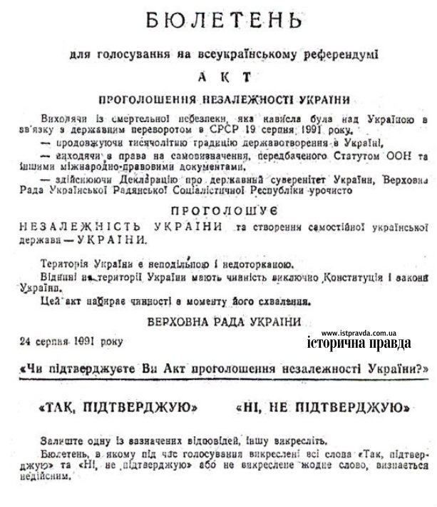 Бюлетень референдуму містив текст Акта проголошення незалежності України та запитання: «Чи підтверджуєте Ви Акт проголошення незалежності України?» І два варіанти відповіді: «Так, підтверджую» або «Ні, не підтверджую».