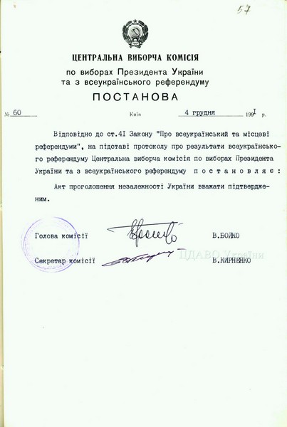 Оскільки Центральна виборча комісія як постійно діючий орган утворена лише 1997 року, а також вона не стала правонаступницею Центральної виборчої комісії з виборів народних депутатів України, то ЦВК не має інформації про результати підрахунку голосів на референдумі 1991 року. А всі відповідні документи зберігаються в Центральному державному архіві вищих органів влади та управління України (ЦДАВО).