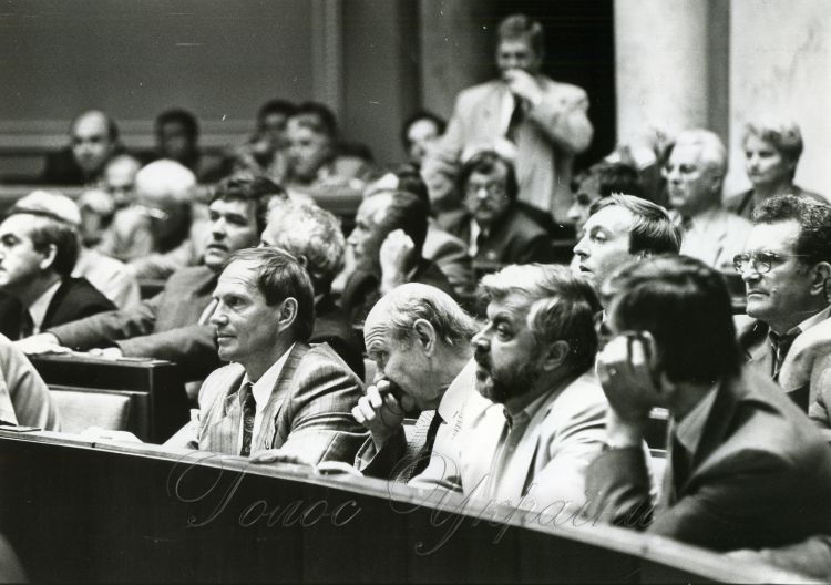 Засідання Верховної Ради 24 вересня 1993 року. У центрі: Ярослав Кендзьор, Ігор Юхновський, Леонід Танюк. Джерело: Голос України