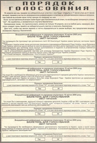 Згідно з указом Президента Леоніда Кучми «Про проголошення всеукраїнського референдуму за народною ініціативою» на референдум було винесено чотири питання.