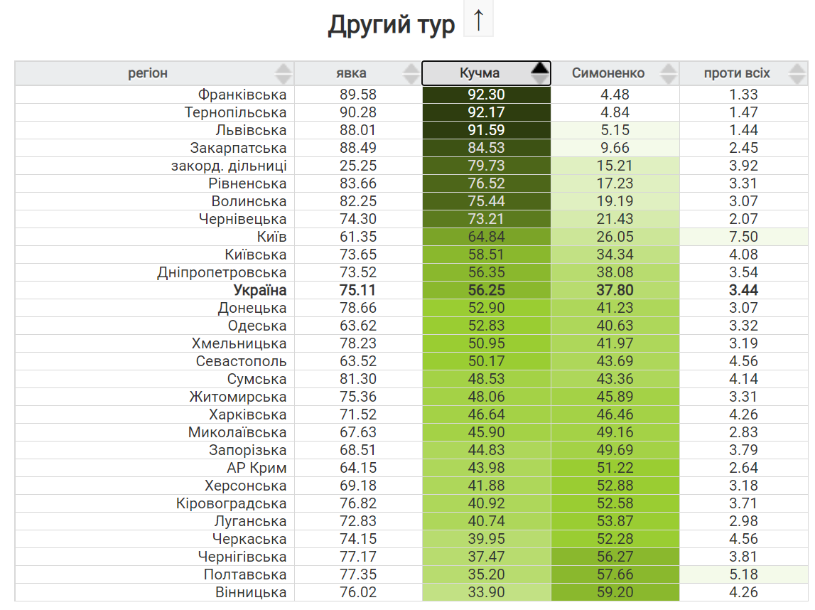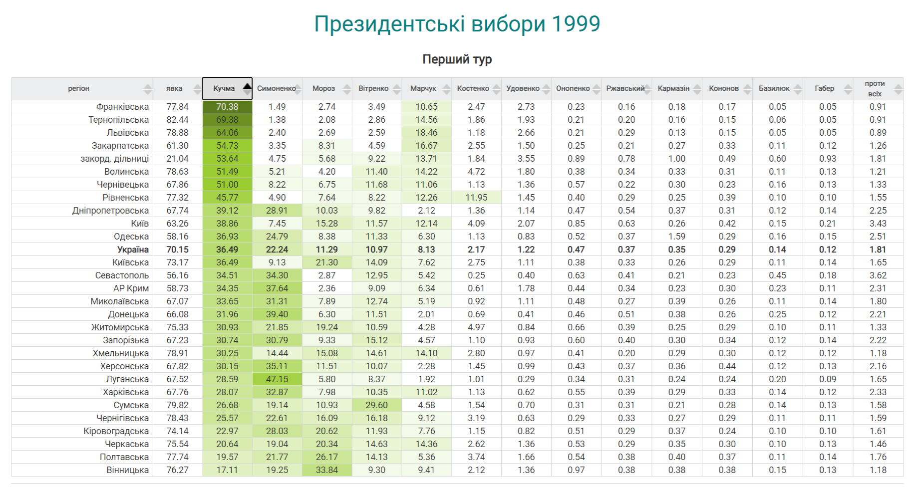 Кучму більшою мірою підтримують у Західному регіоні (27%) та в Києві (24%), найменшою — в Центральному регіоні (7%) та в Криму (10%). За Вітренко були готові проголосувати найбільшою мірою у Східному (21%) та Центральному регіонах (20%), найменшою — на Заході (8%). За Олександра Мороза найбільше — в Центральному регіоні (14%), найменше — у Києві (2%) та Криму (5%). За Петра Симоненка найбільше — у Східному (16%) та Південному (16%) регіонах, найменше — у Києві (3%) та Західному регіоні (1%). За Євгена Марчука найбільше були готові проголосувати на Заході України (12%), найменше — у Південному (2%), Північному (4%) та Східному (2%) регіонах.