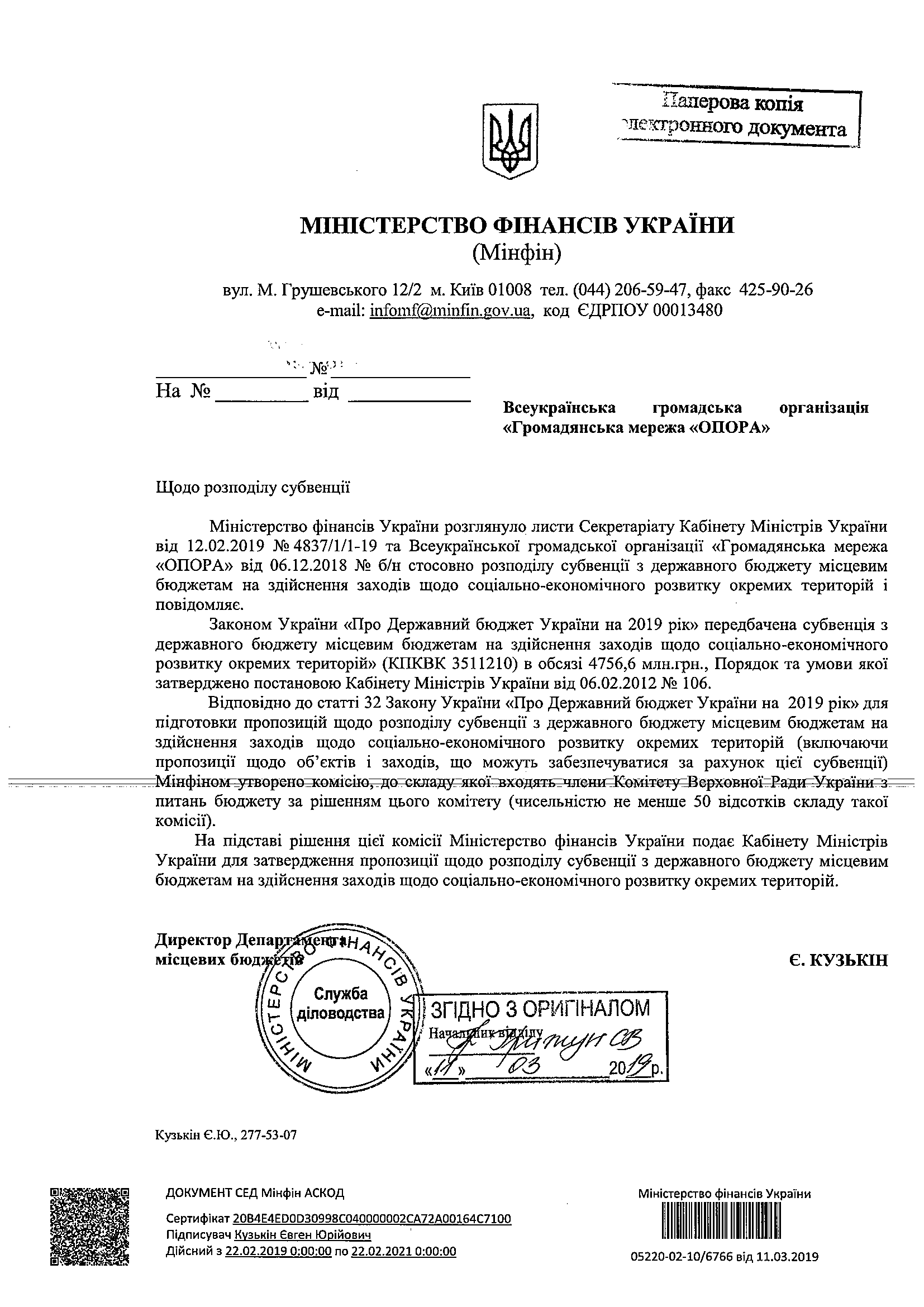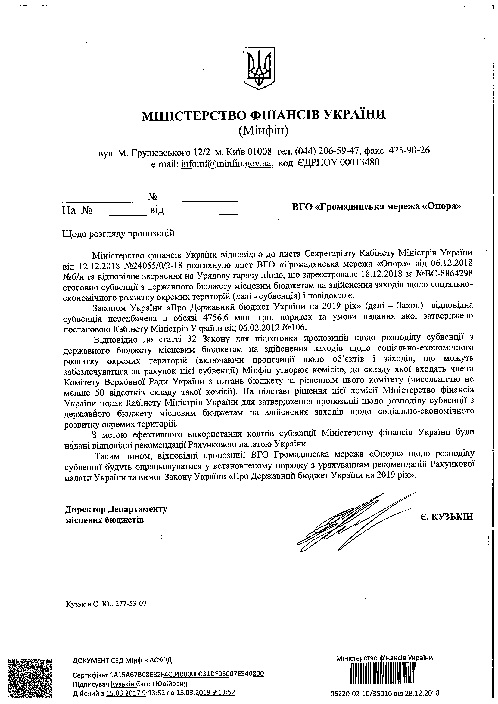 Загалом активісти ОПОРИ отримали дві відповіді від Міністерства фінансів України, які проте виявилися лише формальними відписками. В обох відповідях урядовці перерахували вже й так відомі законодавчі механізми розподілу державних субвенцій на соціально-економічний розвиток та зазначили, «що пропозиції Громадської мережі «ОПОРА» будуть опрацьовуватися у встановленому порядку з урахуванням рекомендацій Рахункової палати та вимог Закону «Про Державний бюджет України на 2019 рік».