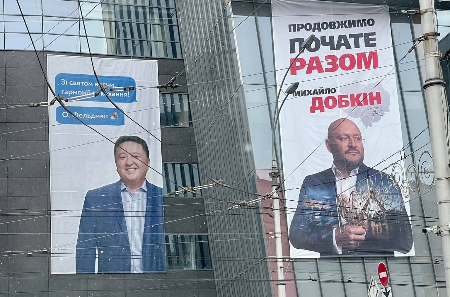Представник партії «Опозиційна платформа — За життя» у Верховній Раді України Олександр Фельдман розмістив зовнішню рекламу зі своїм зображенням та критикою міської ради. Його зовнішня реклама пов’язана з іще одним потенційним кандидатом — Михайлом Добкіним. На будівлях, які належать концерну АВЕК та КО, поруч із зовнішньою рекламою Олександра Фельдмана розміщувалася реклама й Михайла Добкіна, зокрема на фасаді будівлі АВЕК та на приміщеннях ринку «Барабашово». Сам Фельдман на власній сторінці у Facebook висловився на користь Добкіна. Показово, що вся інша реклама Фельдмана та Добкіна розміщена в передмістях на в’їзді до Харкова, проте в самому місті домінує реклама Ігоря Терехова.
