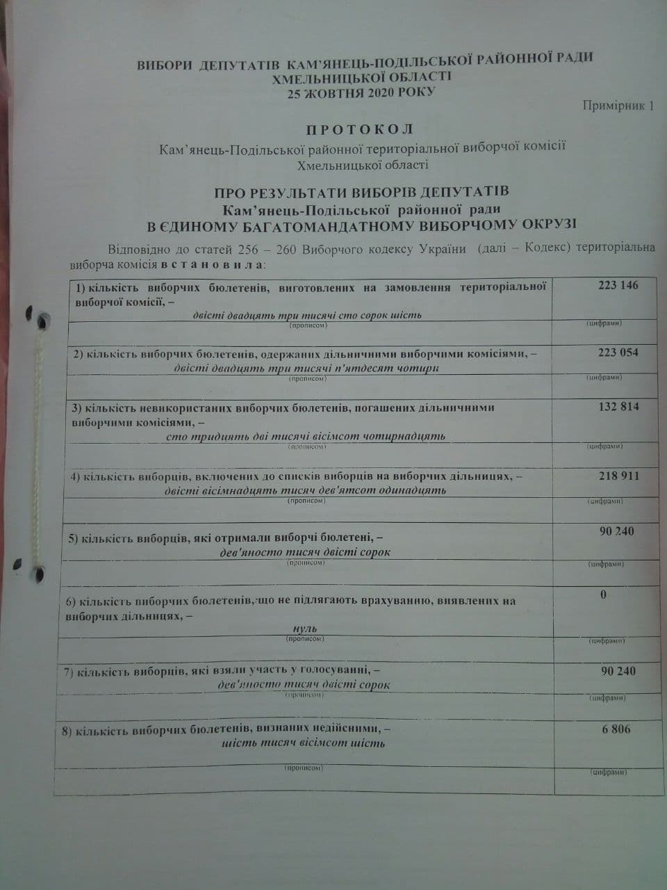 У протоколі Кам’янець-Подільської районної ТВК зазначено, що в голосуванні за депутатів районної ради взяли участь 90 240 виборців, а 5 і більше відсотків голосів виборців набрали 8 політичних сил. Лідеркою за кількістю здобутих мандатів стала партія «Слуга народу». Не вдалося подолати 5-відсотковий бар’єр виборчому списку партії «Сила і честь». Отже 42 місця у Кам’янець-Подільській районній раді дісталися таким партіям: