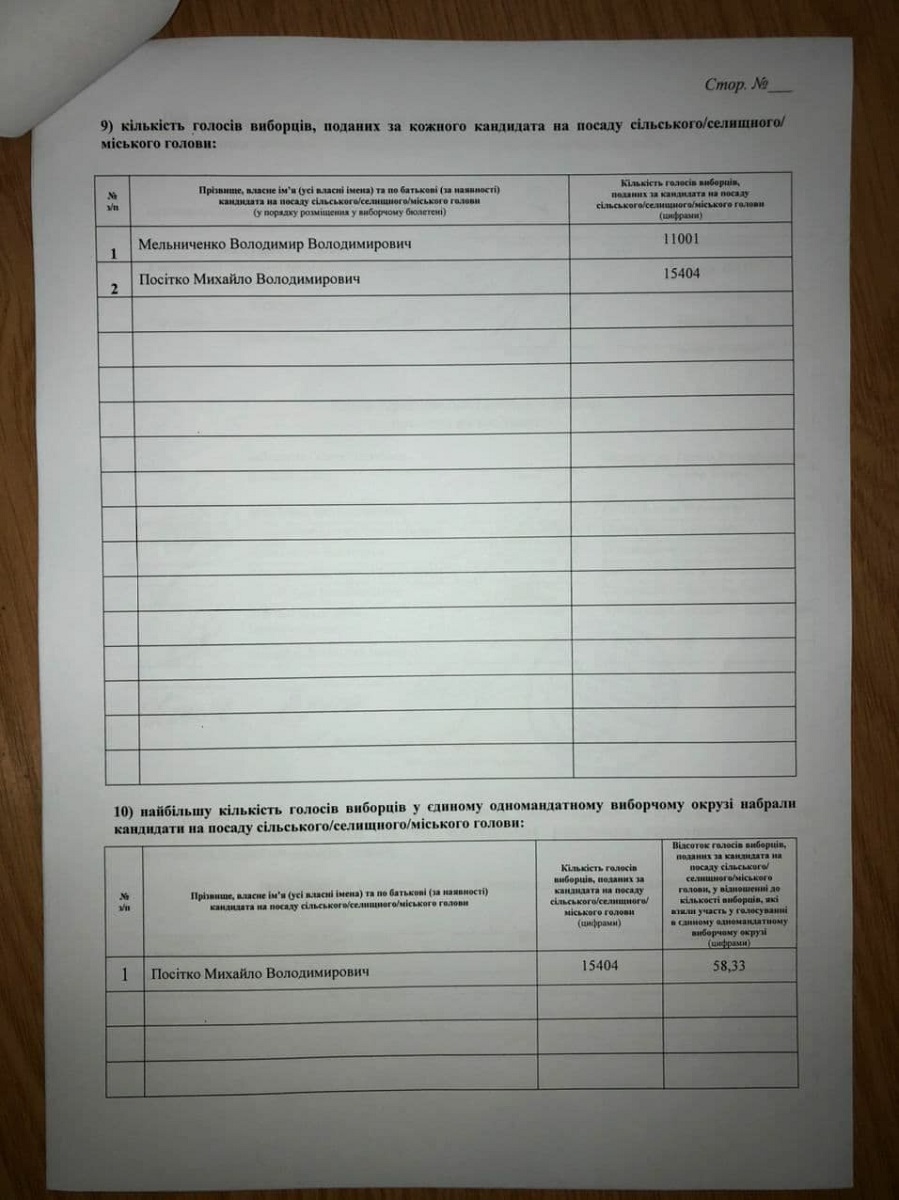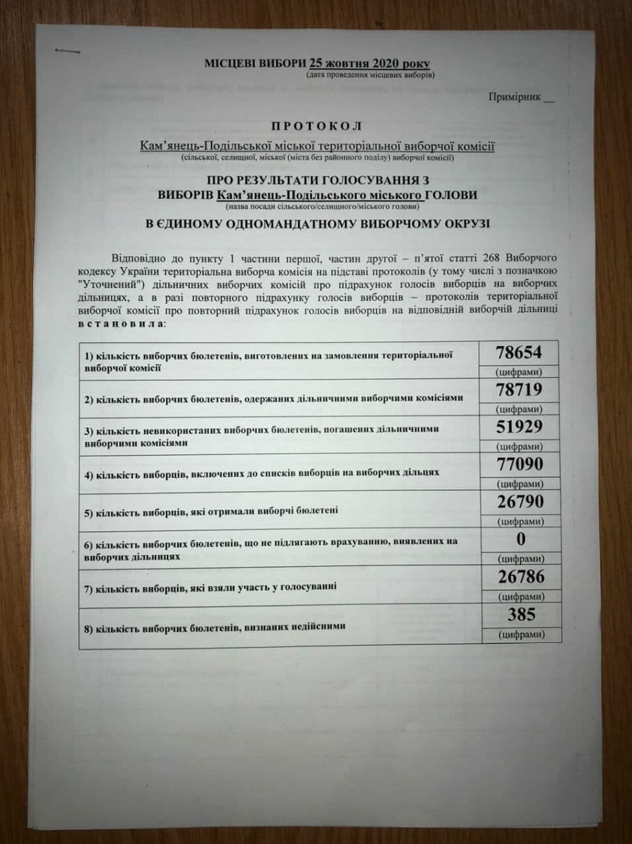 Кам’янець-Подільська міська ТВК встановила результати голосування з виборів міського голови Кам’янця-Подільського. Відповідно до протоколу комісії від 16 листопада 2020 року в голосуванні взяли участь 26 786 виборців. Із двох кандидатів, які змагалися за посаду міського очільника, більшу кількість голосів набрав кандидат від ВО «Свобода» Михайло Посітко. За нього проголосували 15 404 виборці, що становить 58,33% голосів. Самовисуванець Володимир Мельниченко отримав 11 001 голос.