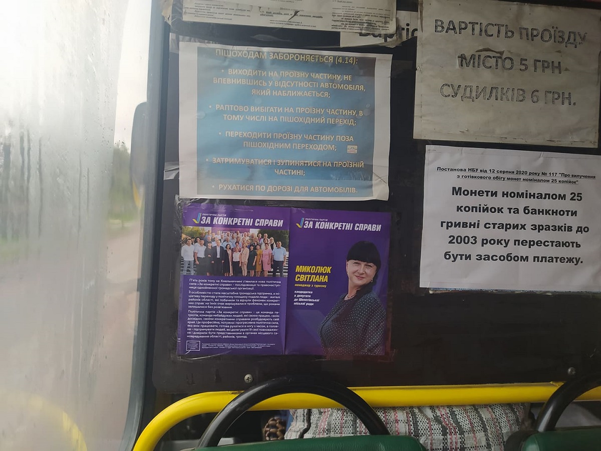 Друковані агітаційні матеріали політичної партії «За конкретні справи» спостерігач ОПОРИ виявив 18 жовтня у Шепетівці, в транспортних засобах, які рухаються за маршрутами №№1, 5, 5-А, а також на маршруті «Шепетівка-Конотоп». В автобусах розклеїли листівки й плакати кандидатки на посаду міського голови Шепетівки Світлани Павлишиної та кандидатки в депутати Шепетівської міської ради Світлани Миколюк. Крім того, у зоні водія розмістили агітаційні газети партії із зображенням кандидата в депутати Хмельницької обласної ради, народного депутата Олександра Гереги. Пасажири могли вільно брати агітки, а на маршруті №1 водій сам пропонував ознайомитися з ними.