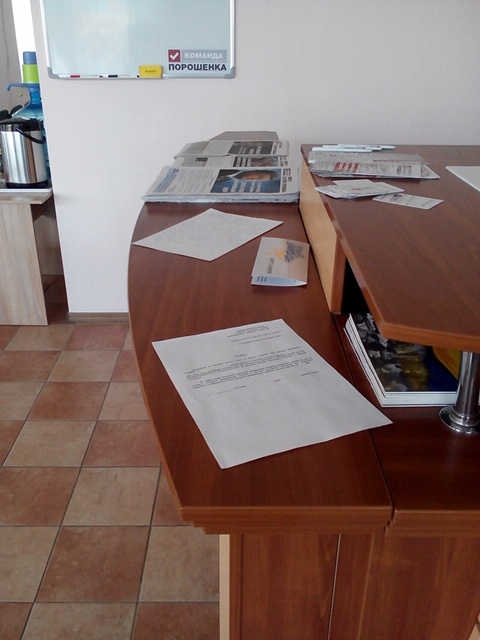 Близько 11 години 23 березня у «відкритому офісі» команди Порошенка, розташованому в місті Шепетівці, спостерігач ОПОРИ зафіксував порожні бланки заяв для реєстрації спостерігачами від Громадської організації «Український центр демократичного суспільства». Бланки лежали на стійці реєстрації поряд із агітаційною продукцією – газетами з логотипом «Команда Порошенка» під назвою «Чому я за Петра Порошенка». В цей час в офісі перебували всього двоє відвідувачів та безпосередньо представниця офісу. Спостерігач ОПОРИ без проблем отримав примірник зазначеного бланку заяви на спостереження та зразки друкованої агітаційної продукції.