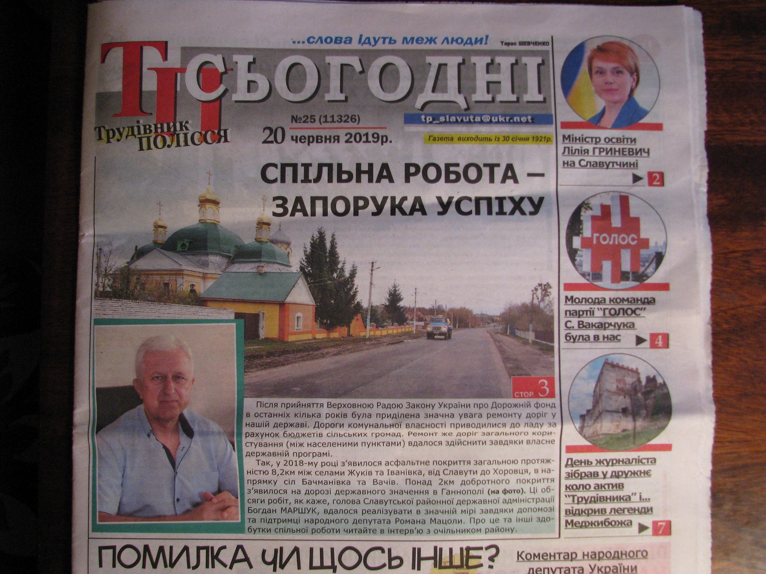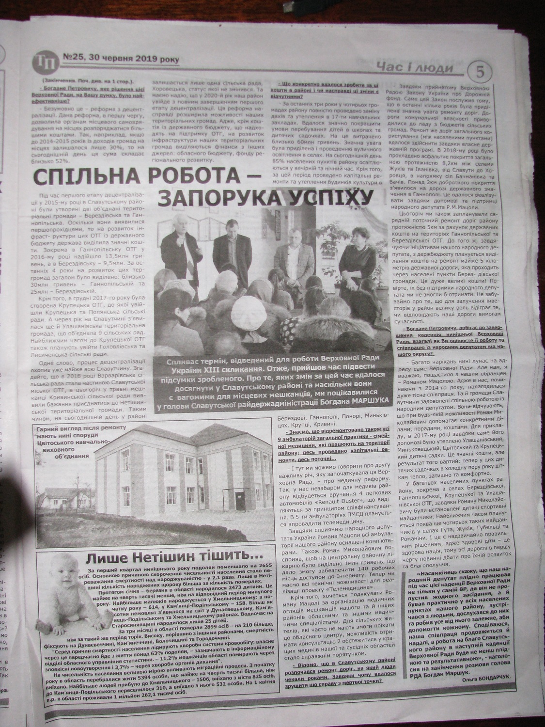 Матеріал «Спільна робота – запорука успіху» з’явився на шпальтах славутського тижневика «Трудівник Полісся», датованого 20 червня 2019 року. В розлогому інтерв’ю голова Славутської районної державної адміністрації Богдан Маршук перелічує, яких успіхів вдалося досягти у районі завдяки співпраці з чинним народним депутатом від округу Романом Мацолою.