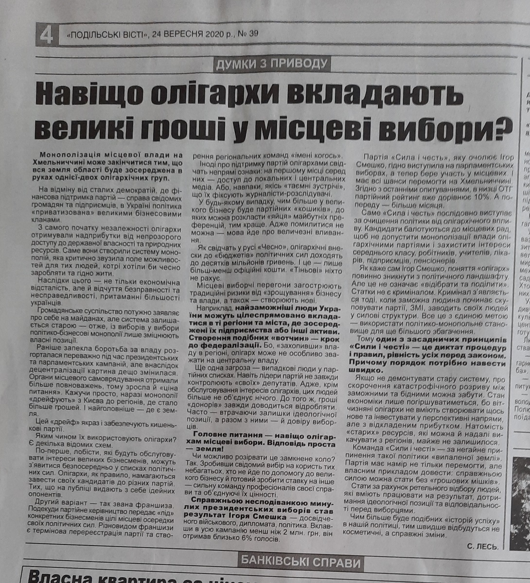 Ще одна публікація на користь партії «Сила і честь» у цьому номері «Подільських вістей» має назву «Навіщо олігархи вкладають великі гроші у місцеві вибори» (рубрика «Думки з приводу»). На противагу проблемі «монополізації влади» на Хмельниччині автор (чи авторка) наводить переваги партії «Сила і честь»: «Саме «Сила і честь» послідовно виступає за очищення політики від олігархічного впливу. Кандидати балотуються до місцевих рад, щоб не допустити монополізації влади олігархічними партіями і захистити інтереси середнього класу, робітників, учителів, лікарів, підприємців, пенсіонерів».