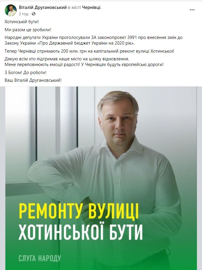 17 вересня 2020 року з Державного бюджету виділили понад 200 мільйонів гривень на ремонт вулиці Хотинської, яка є трасою міжнародного та національного значення. Ймовірний кандидат у мери Чернівців від “Слуги народу” Віталій Другановський у соцмережах пише про сприяння ремонту Хотинської, а чинний депутат міської ради Чернівців Володимир Бешлей згадує Віталія Другановського як “небайдужого до цієї проблеми”.
