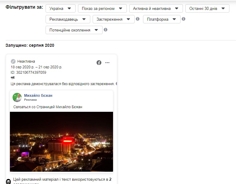 Керівник обласного виборчого штабу «Слуга народу» Михайло Бєжан один раз замовляв політичну рекламу зі своєї Facebook-сторінки.