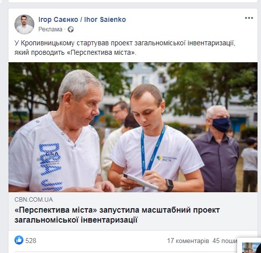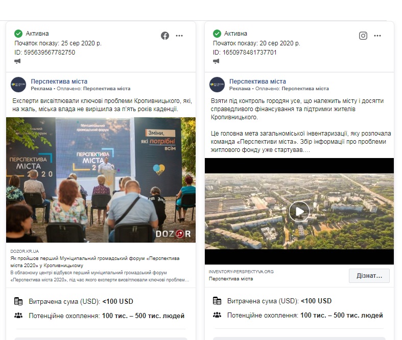 Політична партія «Перспектива міста» чотири рази замовляли рекламу в соціальних мережах. Наразі в Facebook активні дві реклами цієї політичної сили щодо ініціативи загальноміської інвентаризації від потенційного кандидата на міського голову Кропивницького Артема Стрижакова.